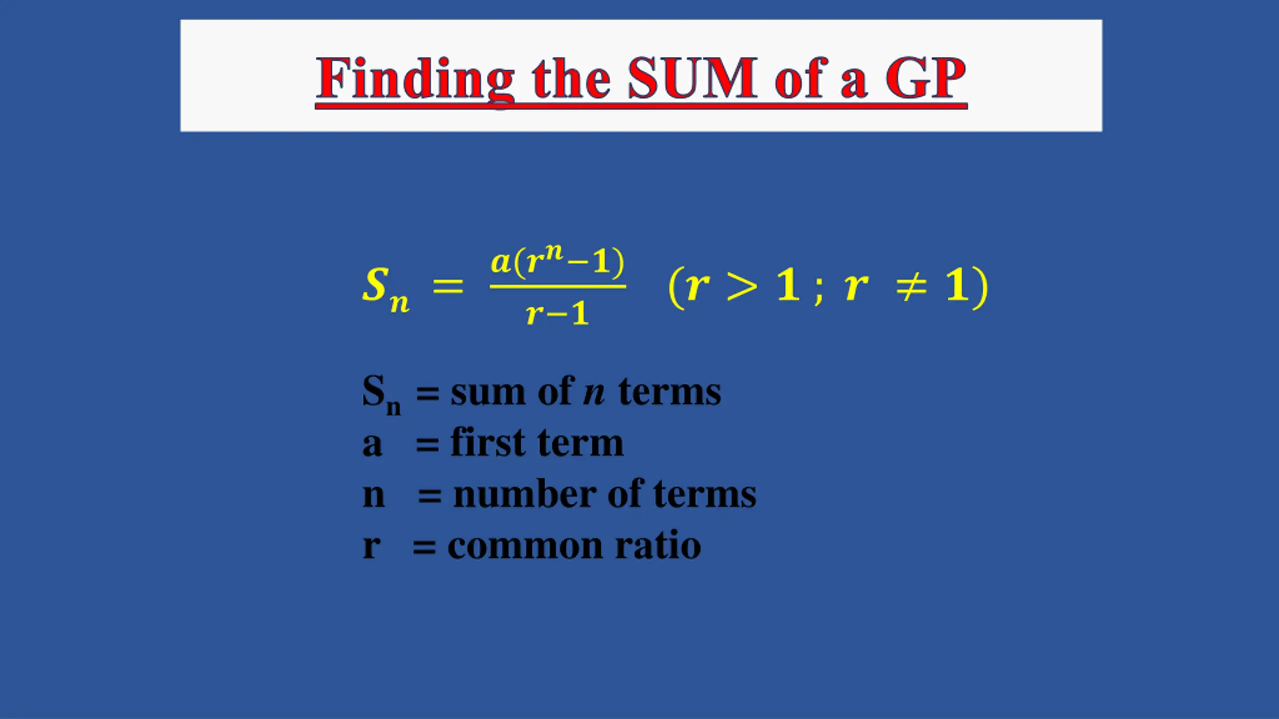 Finding the SUM of a GP ?(?? ?) ? ? (? > ? ; ? ?) ??= Sn = sum of n terms a = first term n = number of terms r = common ratio
