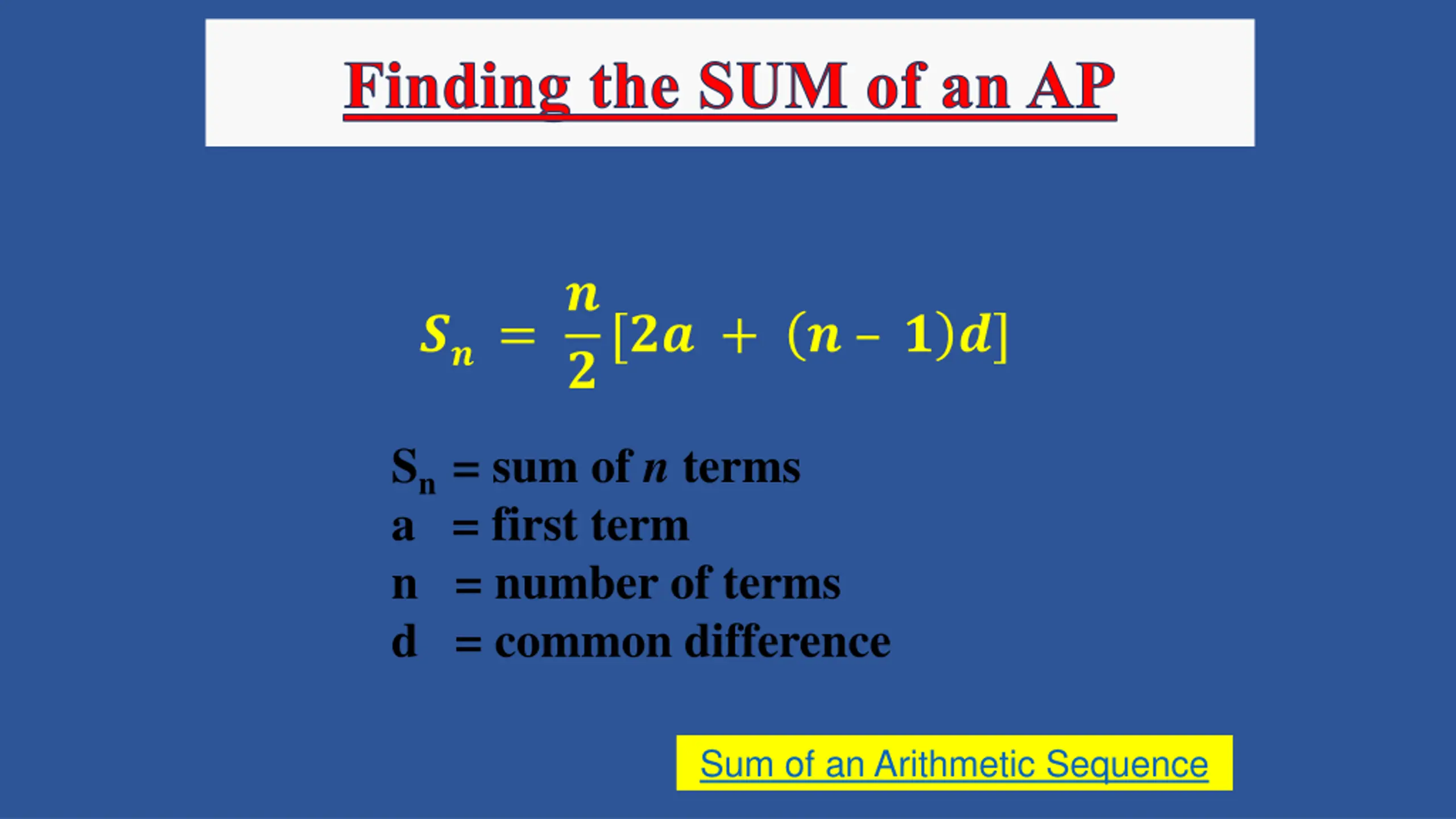 Finding the SUM of an AP ? ?[?? + ? ? ?] ??= Sn = sum of n terms a = first term n = number of terms d = common difference Sum of an Arithmetic Sequence