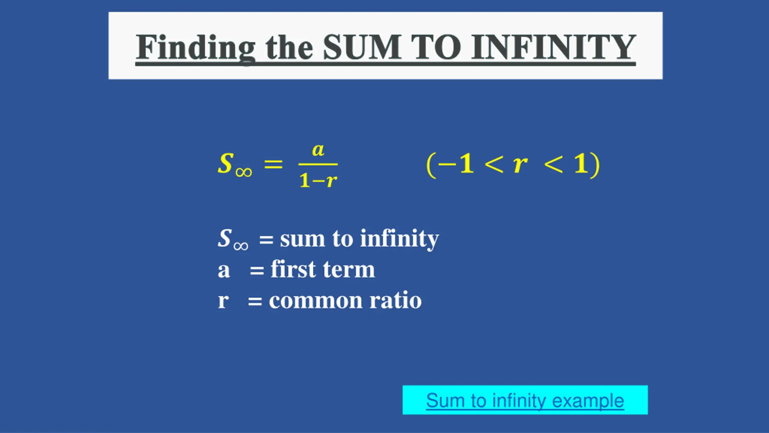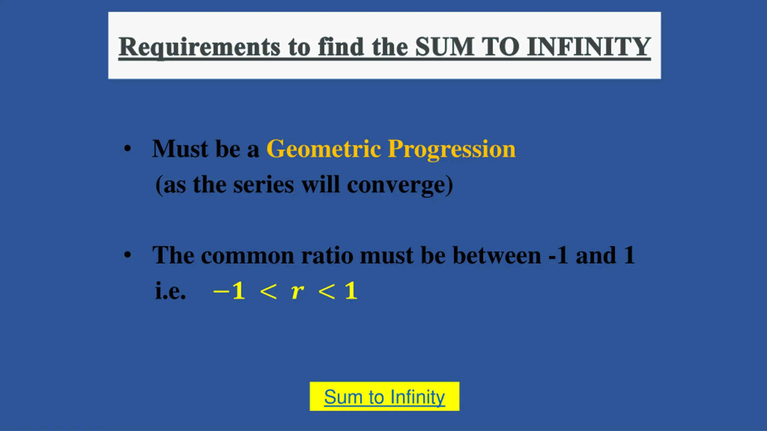 Requirements to find the SUM TO INFINITY Must be a Geometric Progression (as the series will converge) The common ratio must be between -1 and 1 i.e. ? < ? < ? Sum to Infinity