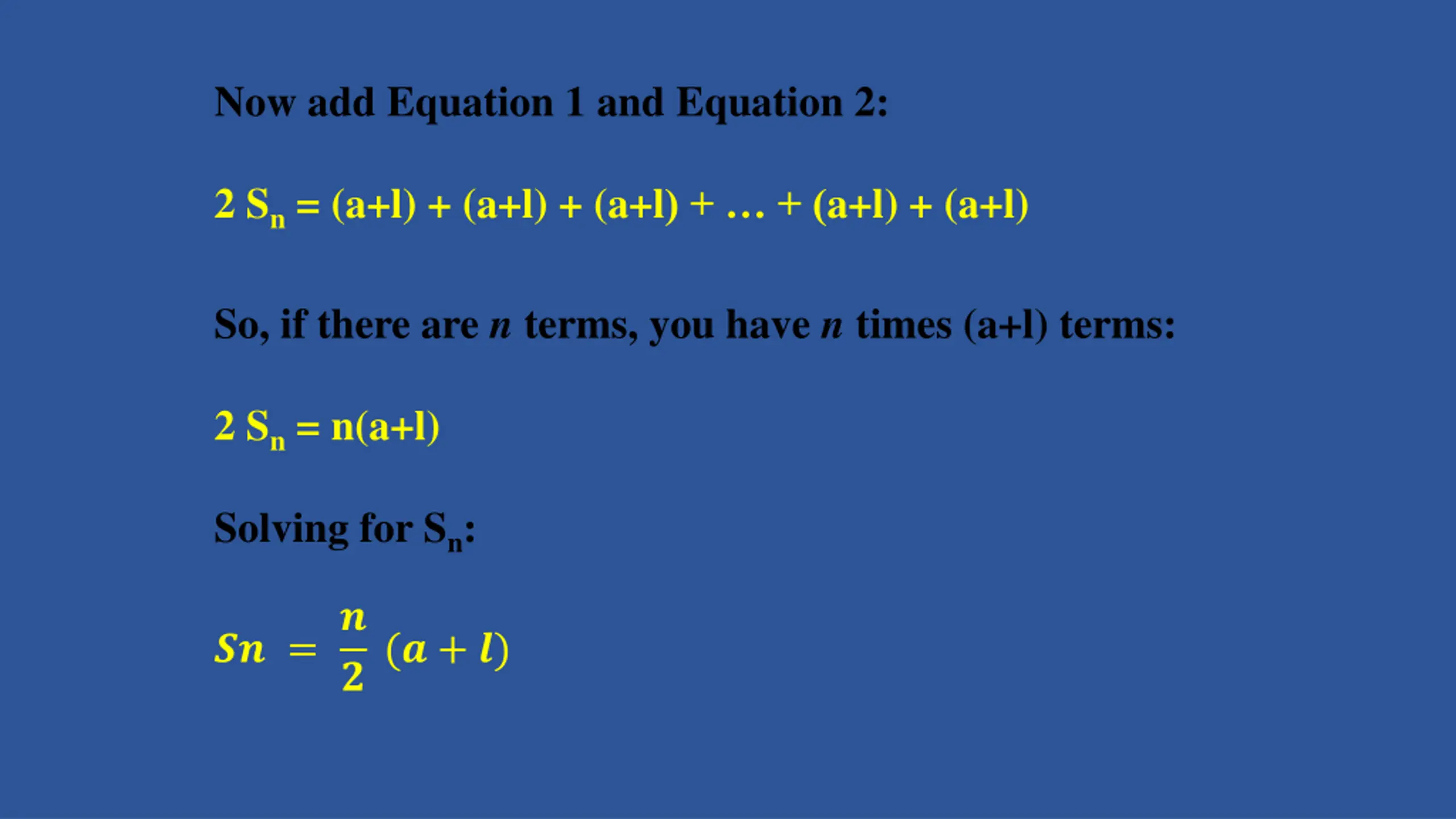 Now add Equation 1 and Equation 2: 2 Sn = (a+l) + (a+l) + (a+l) + + (a+l) + (a+l) So, if there are n terms, you have n times (a+l) terms: 2 Sn = n(a+l) Solving for Sn: ? ? (? + ?) ?? =