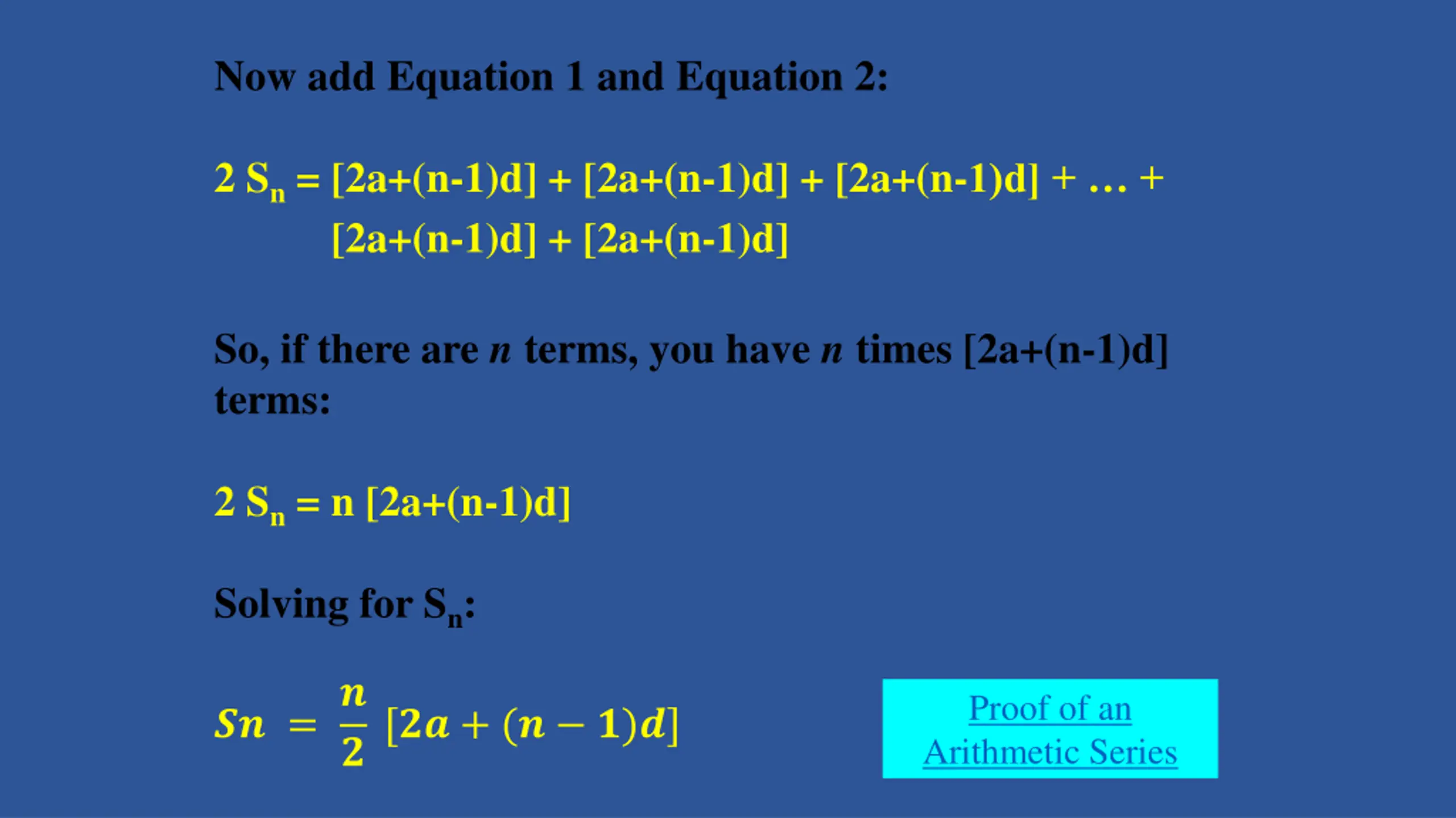 Now add Equation 1 and Equation 2: 2 Sn = [2a+(n-1)d] + [2a+(n-1)d] + [2a+(n-1)d] + + [2a+(n-1)d] + [2a+(n-1)d] So, if there are n terms, you have n times [2a+(n-1)d] terms: 2 Sn = n [2a+(n-1)d] Solving for Sn: ? ? [?? + (? ?)?] Proof of an Arithmetic Series ?? =