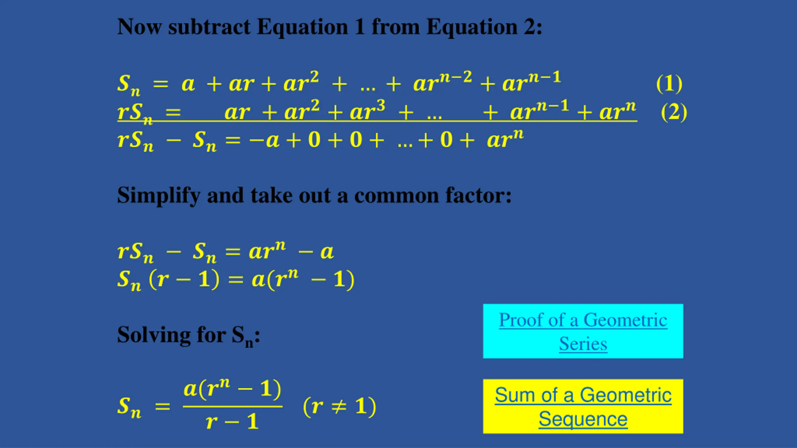 Now subtract Equation 1 from Equation 2: ?? = ? + ?? + ??? + + ??? ?+ ??? ? (1) ??? = ?? + ???+ ??? + ??? ??= ? + ? + ? + + ? + ??? + ??? ?+ ??? (2) Simplify and take out a common factor: ??? ??= ??? ? ?? ? ? = ?(?? ?) Proof of a Geometric Series Solving for Sn: ?(?? ?) ? ? Sum of a Geometric Sequence ?? = (? ?)