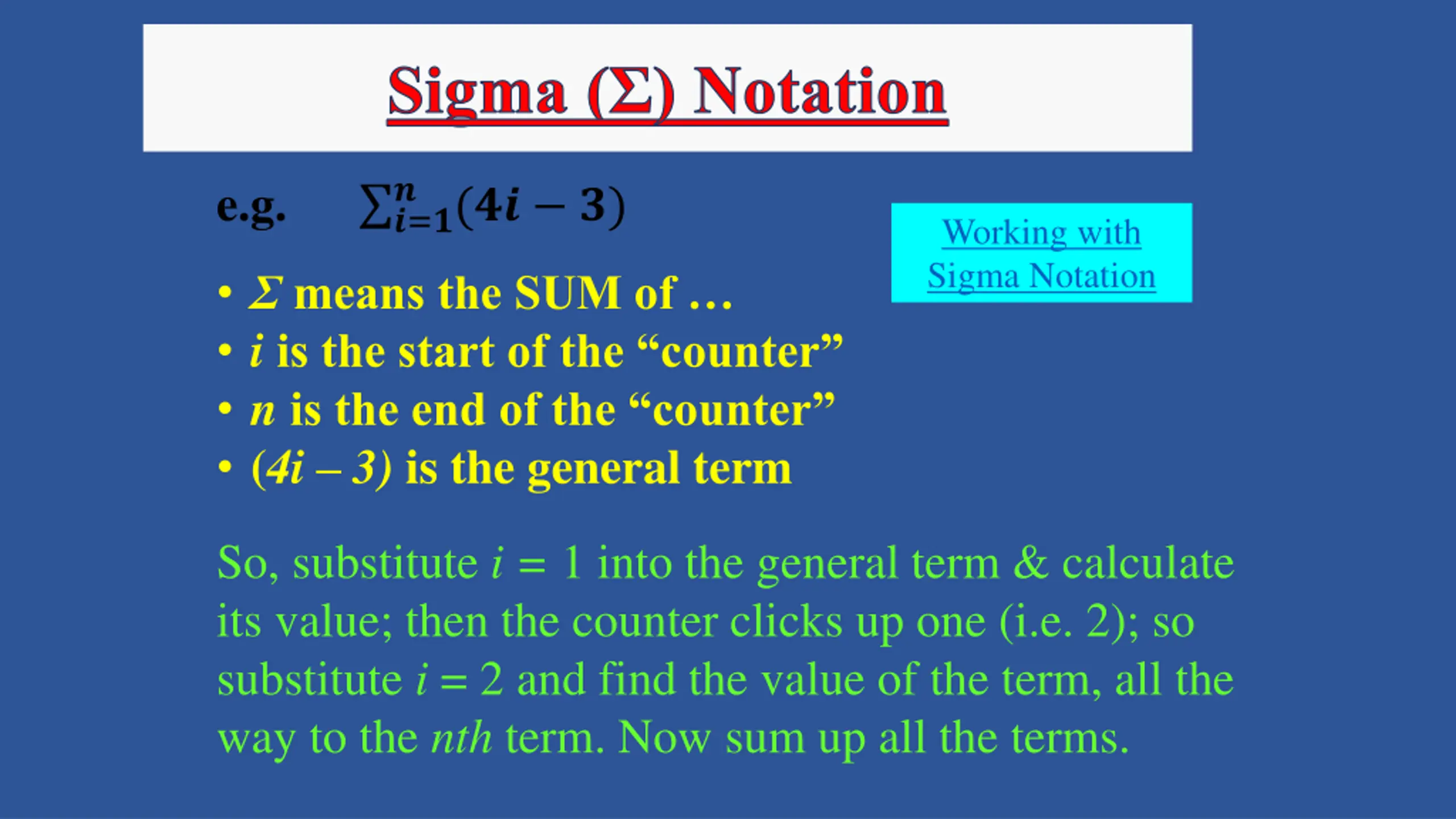 Sigma () Notation ?(?? ?) e.g. ?=? means the SUM of iis the start of the counter nis the end of the counter (4i 3) is the general term Working with Sigma Notation So, substitute i = 1 into the general term & calculate its value; then the counter clicks up one (i.e. 2); so substitute i = 2 and find the value of the term, all the way to the nth term. Now sum up all the terms.