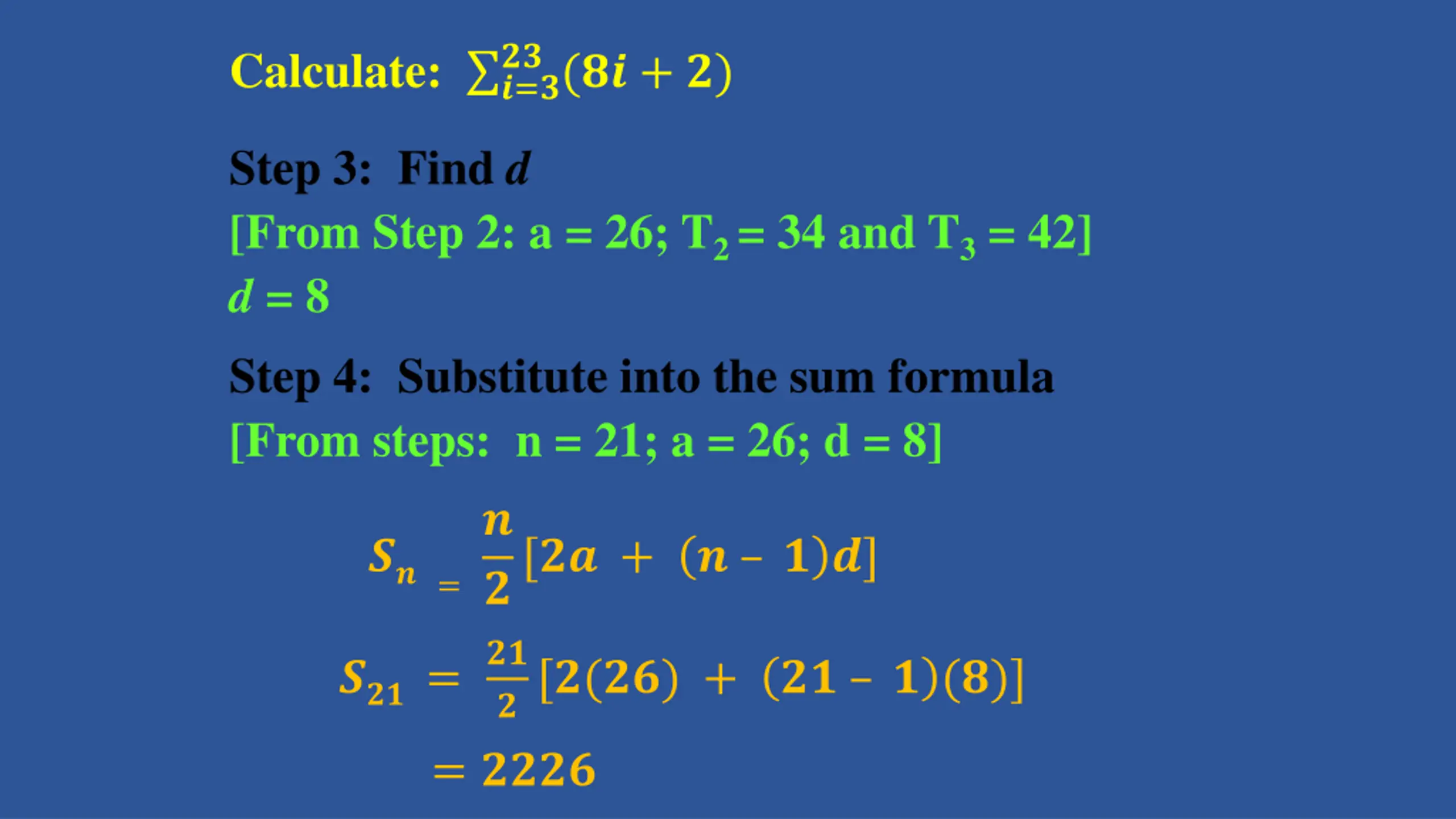 ??(?? + ?) Calculate: ?=? Step 3: Find d [From Step 2: a = 26; T2 = 34 and T3 = 42] d = 8 Step 4: Substitute into the sum formula [From steps: n = 21; a = 26; d = 8] ? ?[?? + ? ? ?] ?? = ?? ?[?(??) + ?? ? (?)] = ???? ??? =