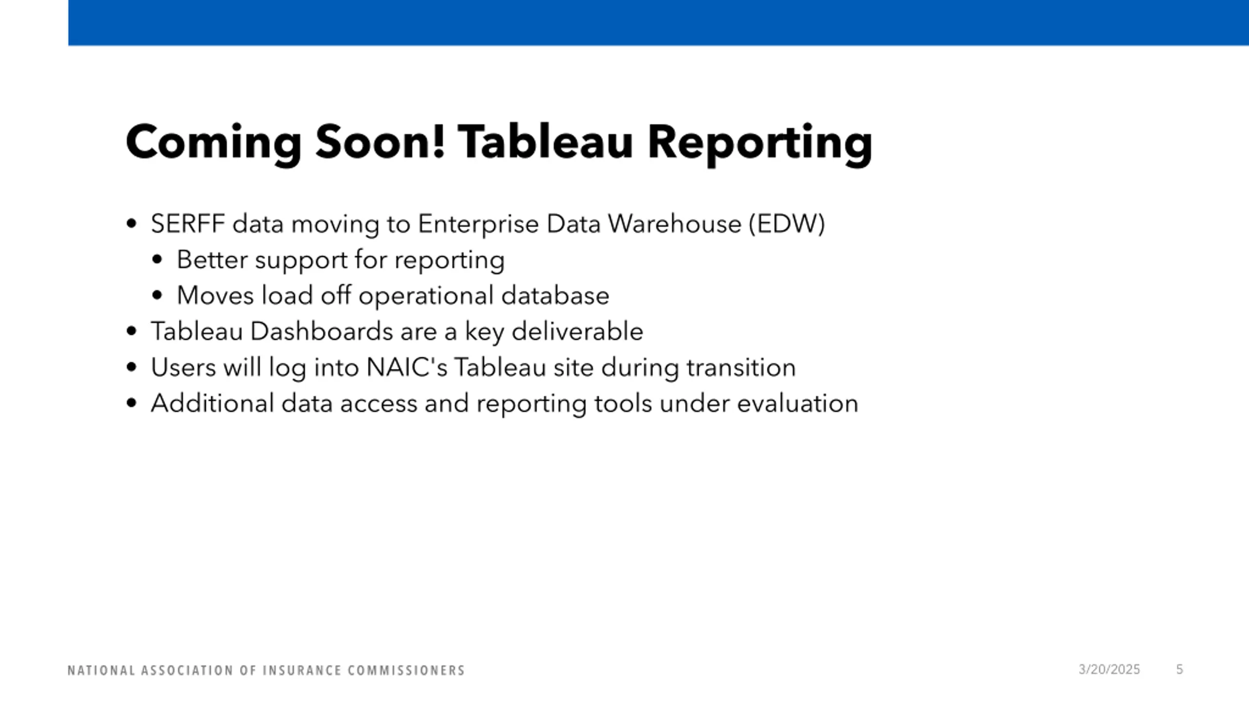 Coming Soon! Tableau Reporting SERFF data moving to Enterprise Data Warehouse (EDW) Better support for reporting Moves load off operational database Tableau Dashboards are a key deliverable Users will log into NAIC's Tableau site during transition Additional data access and reporting tools under evaluation 3/20/2025 5