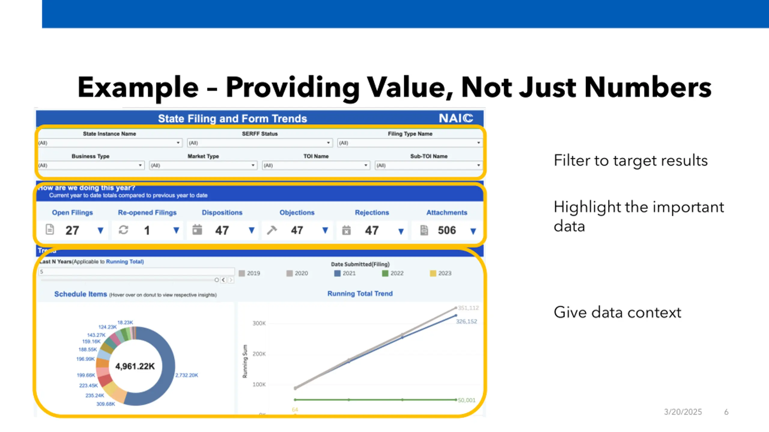 Example Providing Value, Not Just Numbers Filter to target results Highlight the important data Give data context 3/20/2025 6