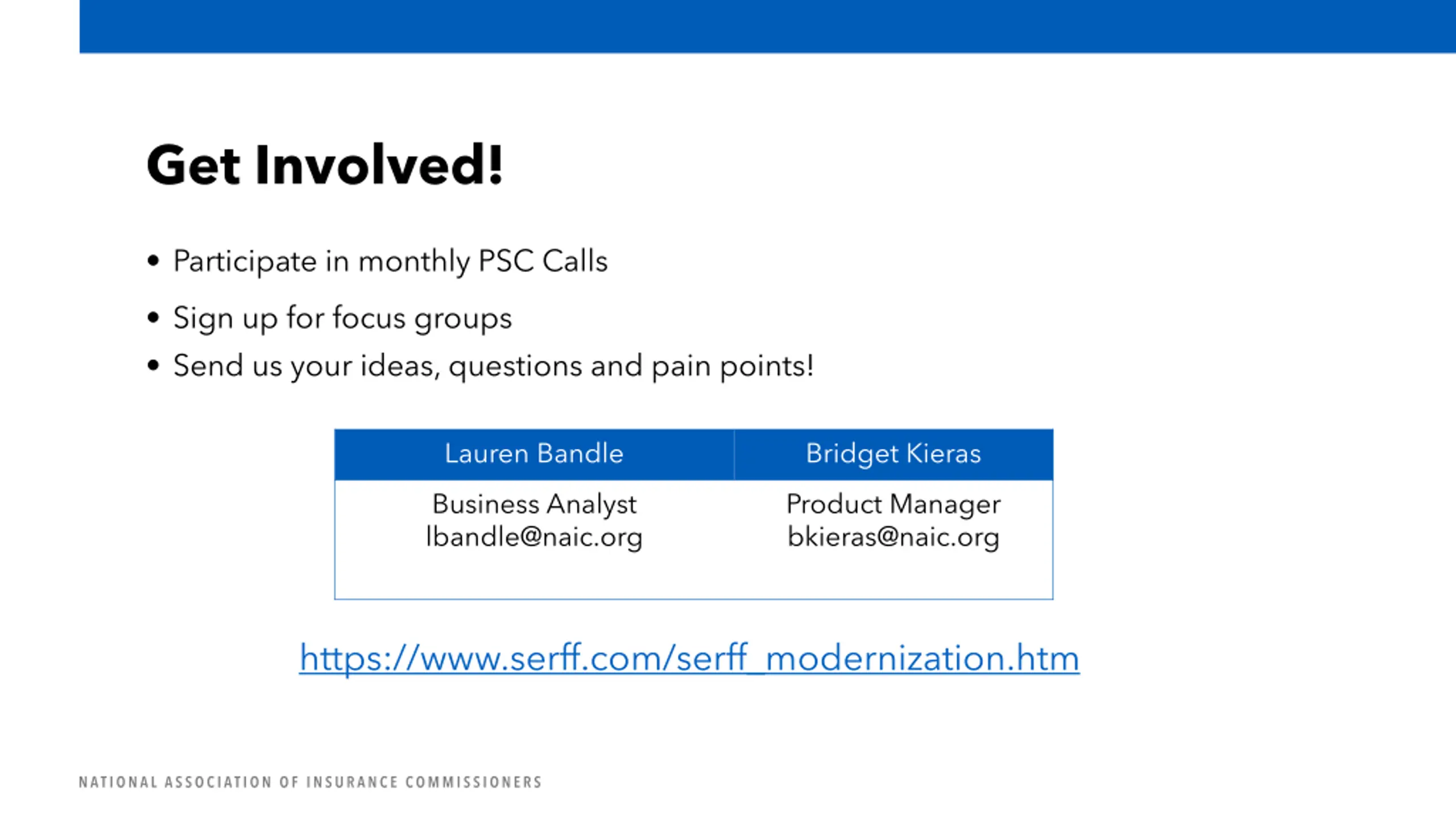 Get Involved! Participate in monthly PSC Calls Sign up for focus groups Send us your ideas, questions and pain points! Lauren Bandle Bridget Kieras Business Analyst lbandle@naic.org Product Manager bkieras@naic.org https://www.serff.com/serff_modernization.htm