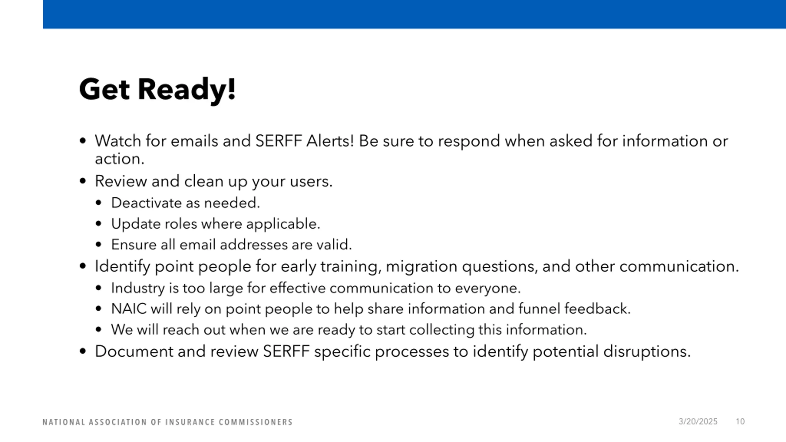 Get Ready! Watch for emails and SERFF Alerts! Be sure to respond when asked for information or action. Review and clean up your users. Deactivate as needed. Update roles where applicable. Ensure all email addresses are valid. Identify point people for early training, migration questions, and other communication. Industry is too large for effective communication to everyone. NAIC will rely on point people to help share information and funnel feedback. We will reach out when we are ready to start collecting this information. Document and review SERFF specific processes to identify potential disruptions. 3/20/2025 10