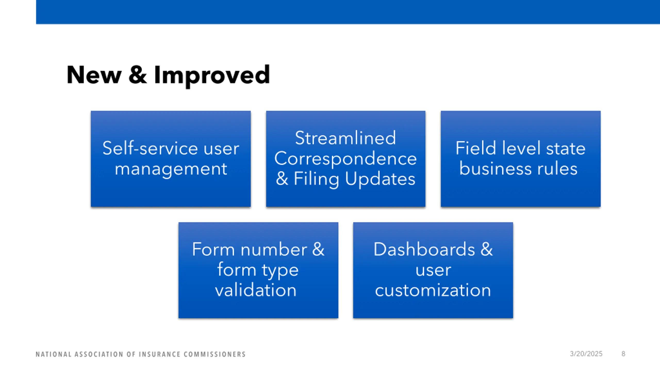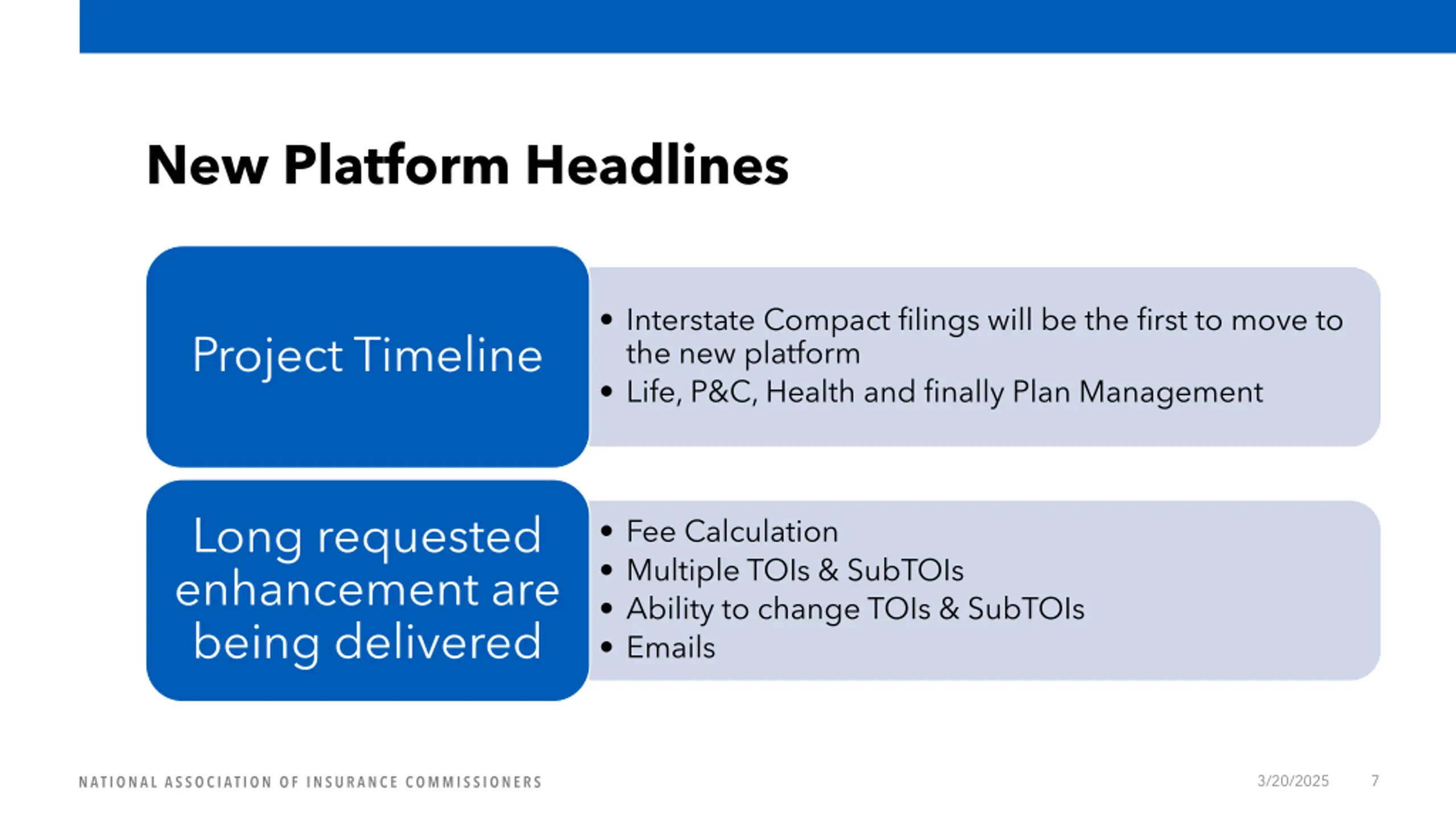 New Platform Headlines Interstate Compact filings will be the first to move to the new platform Life, P&C, Health and finally Plan Management Project Timeline Long requested enhancement are being delivered Fee Calculation Multiple TOIs & SubTOIs Ability to change TOIs & SubTOIs Emails 3/20/2025 7