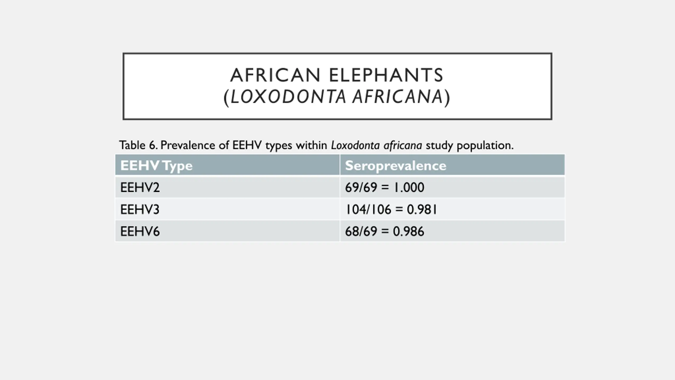 AFRICAN ELEPHANTS (LOXODONTA AFRICANA) Table 6. Prevalence of EEHV types within Loxodonta africana study population. EEHV Type EEHV2 EEHV3 EEHV6 Seroprevalence 69/69 = 1.000 104/106 = 0.981 68/69 = 0.986