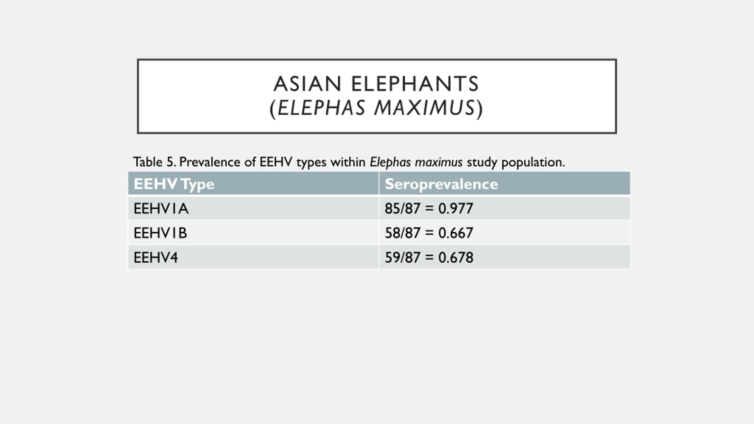 CONCLUSIONS Origin was a statistically significant risk factor for EEHV4 serostatus, with wild-born elephants and elephants born under human care exhibiting a seroprevalence of 23/23 and 34/62, respectively. Age was a statistically significant risk factor for EEHV4 serostatus of Asian elephants and EEHV3 serostatus of African elephants. No test statistic was calculated for age as a risk factor for EEHV2 seroprevalence, as EEHV2 seronegative African elephants were not captured in the sampled population.