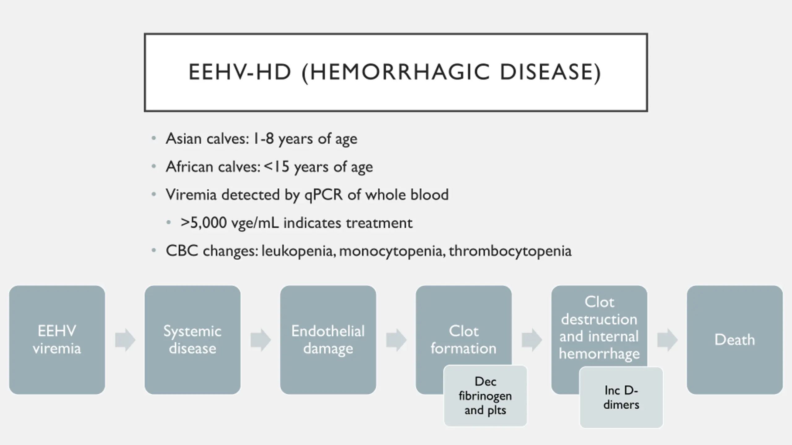 EEHV-HD (HEMORRHAGIC DISEASE) Asian calves: 1-8 years of age African calves: <15 years of age Viremia detected by qPCR of whole blood >5,000 vge/mL indicates treatment CBC changes: leukopenia, monocytopenia, thrombocytopenia Clot destruction and internal hemorrhage EEHV viremia Systemic disease Endothelial damage Clot Death formation Dec Inc D- dimers fibrinogen and plts