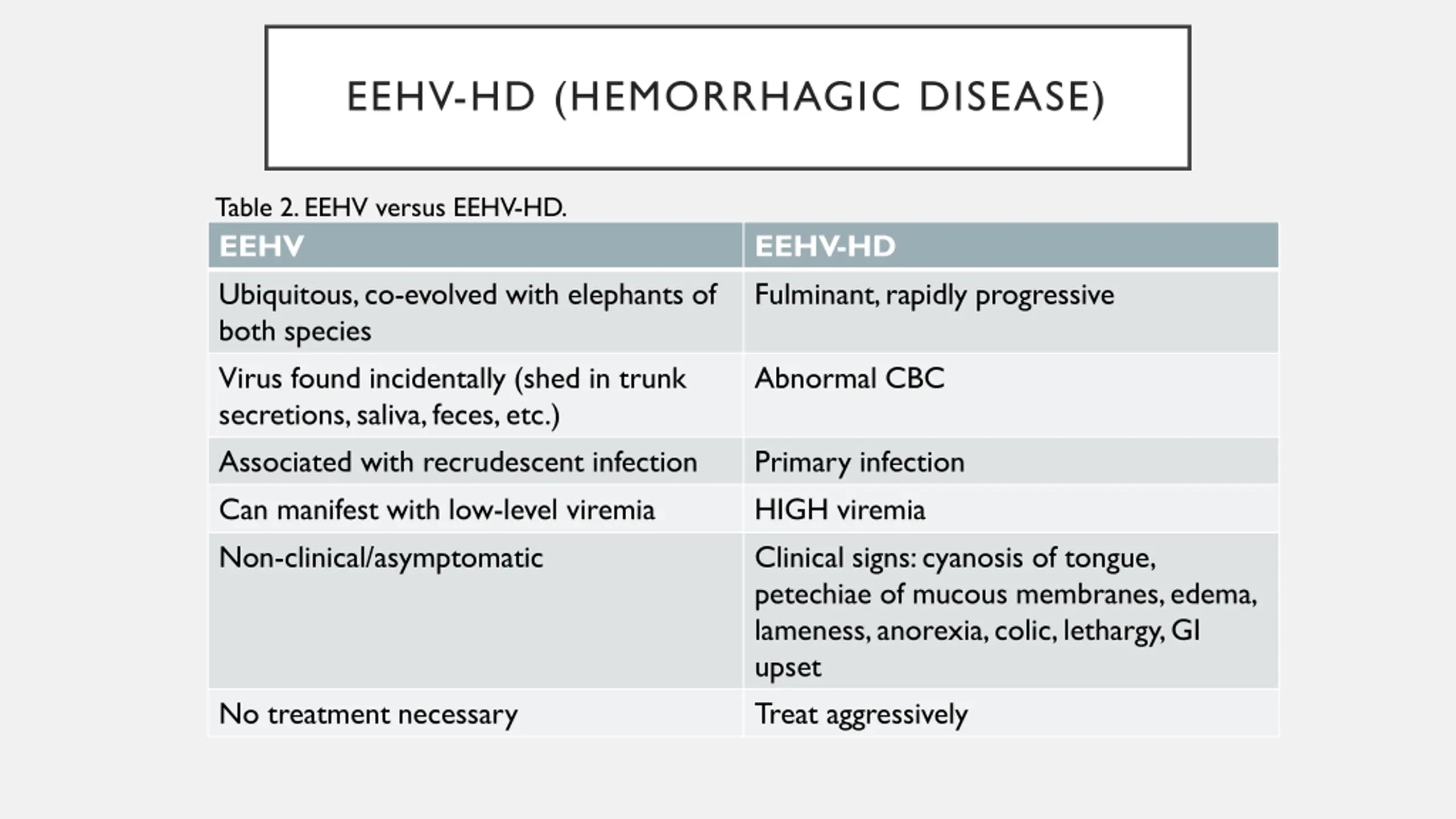 EEHV-HD (HEMORRHAGIC DISEASE) Table 2. EEHV versus EEHV-HD. EEHV Ubiquitous, co-evolved with elephants of both species Virus found incidentally (shed in trunk secretions, saliva, feces, etc.) Associated with recrudescent infection Can manifest with low-level viremia Non-clinical/asymptomatic EEHV-HD Fulminant, rapidly progressive Abnormal CBC Primary infection HIGH viremia Clinical signs: cyanosis of tongue, petechiae of mucous membranes, edema, lameness, anorexia, colic, lethargy, GI upset Treat aggressively No treatment necessary