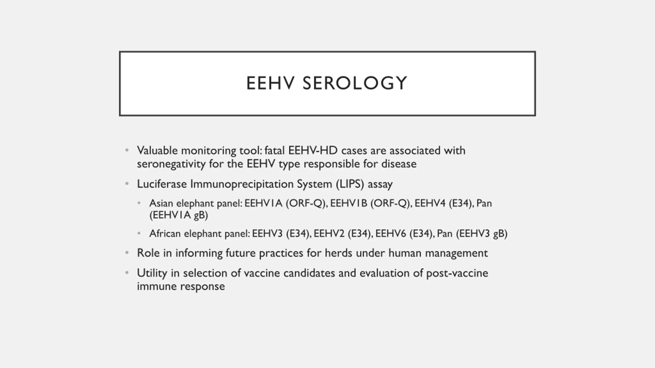 EEHV SEROLOGY Valuable monitoring tool: fatal EEHV-HD cases are associated with seronegativity for the EEHV type responsible for disease Luciferase Immunoprecipitation System (LIPS) assay Asian elephant panel: EEHV1A (ORF-Q), EEHV1B (ORF-Q), EEHV4 (E34), Pan (EEHV1A gB) African elephant panel: EEHV3 (E34), EEHV2 (E34), EEHV6 (E34), Pan (EEHV3 gB) Role in informing future practices for herds under human management Utility in selection of vaccine candidates and evaluation of post-vaccine immune response