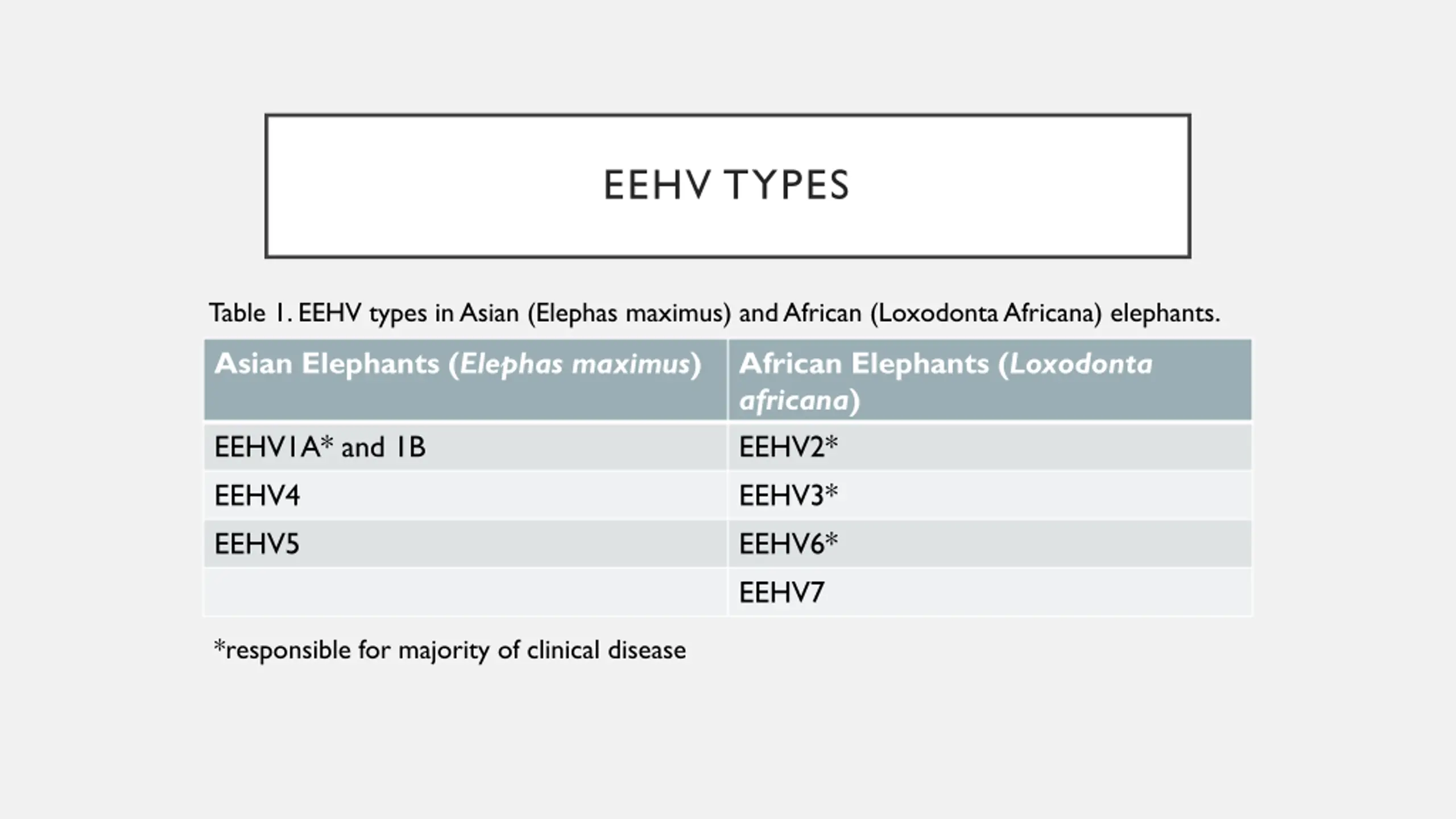 EEHV: BACKGROUND Index case: 1995 at the National Zoo Taxonomy Family: Herpesviridae Subfamily: Betaherpesvirinae (proposed Deltaherpesvirinae) Genus: Proboscivirus Herpesviruses are very host-specific (EEHV in elephants only) EEHV co-evolved with elephants over millions of years Prevalent in human care AND in range countries