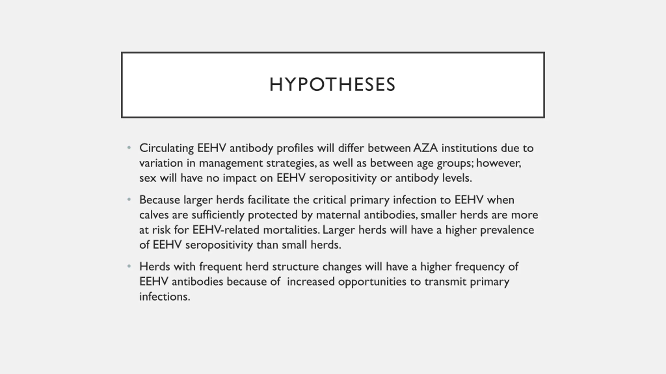 HYPOTHESES Circulating EEHV antibody profiles will differ between AZA institutions due to variation in management strategies, as well as between age groups; however, sex will have no impact on EEHV seropositivity or antibody levels. Because larger herds facilitate the critical primary infection to EEHV when calves are sufficiently protected by maternal antibodies, smaller herds are more at risk for EEHV-related mortalities. Larger herds will have a higher prevalence of EEHV seropositivity than small herds. Herds with frequent herd structure changes will have a higher frequency of EEHV antibodies because of increased opportunities to transmit primary infections.