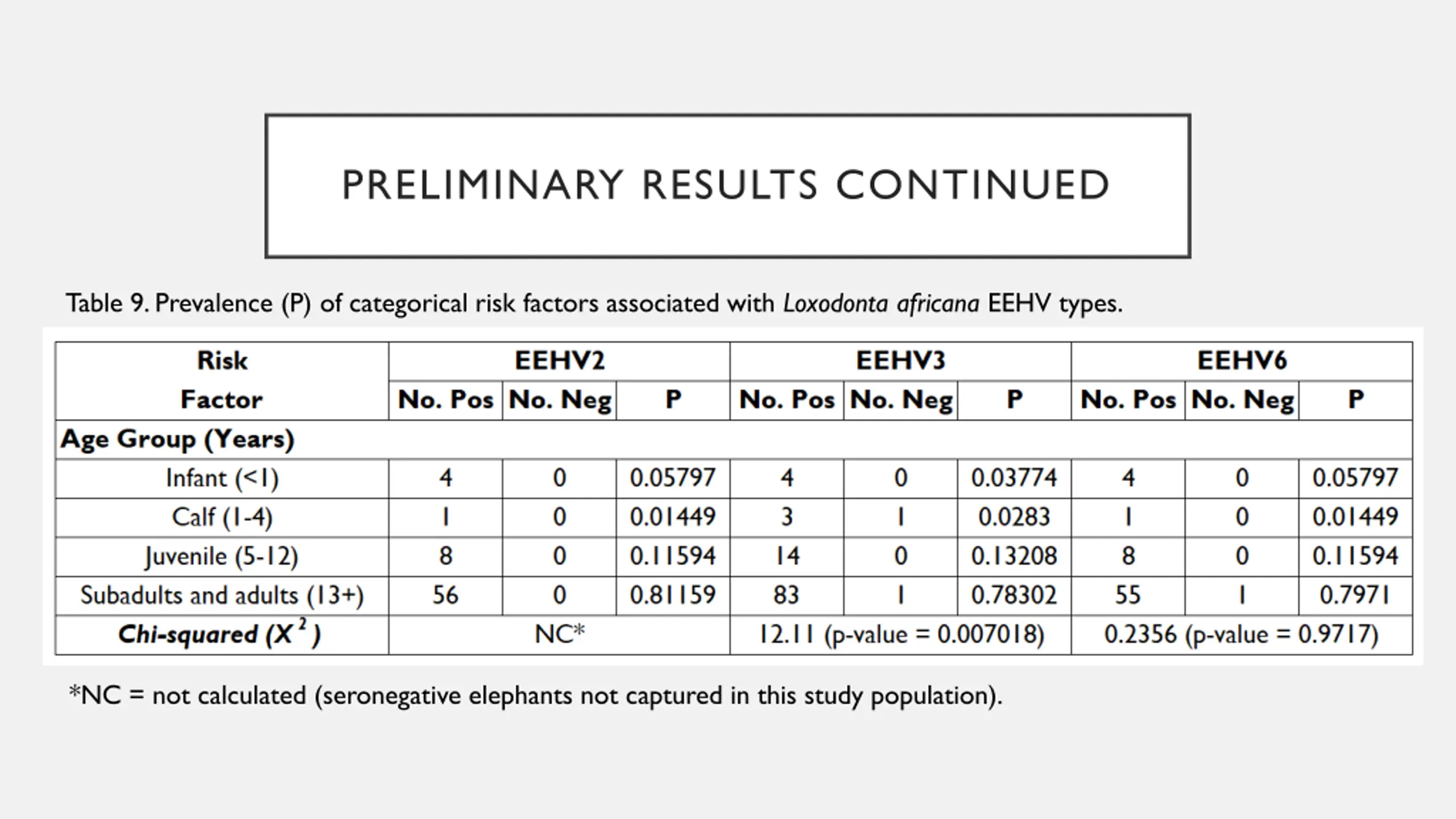 PRELIMINARY RESULTS CONTINUED Table 9. Prevalence (P) of categorical risk factors associated with Loxodonta africana EEHV types. *NC = not calculated (seronegative elephants not captured in this study population).
