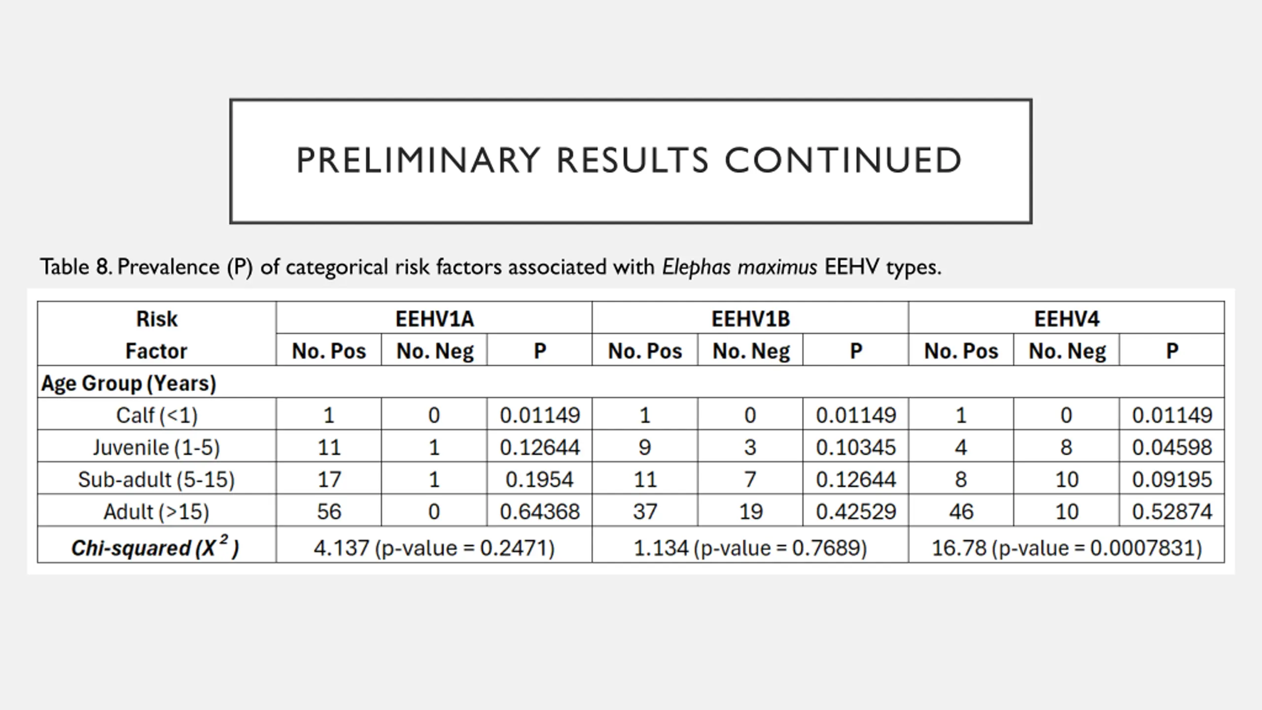 PRELIMINARY RESULTS CONTINUED Table 8. Prevalence (P) of categorical risk factors associated with Elephas maximus EEHV types.