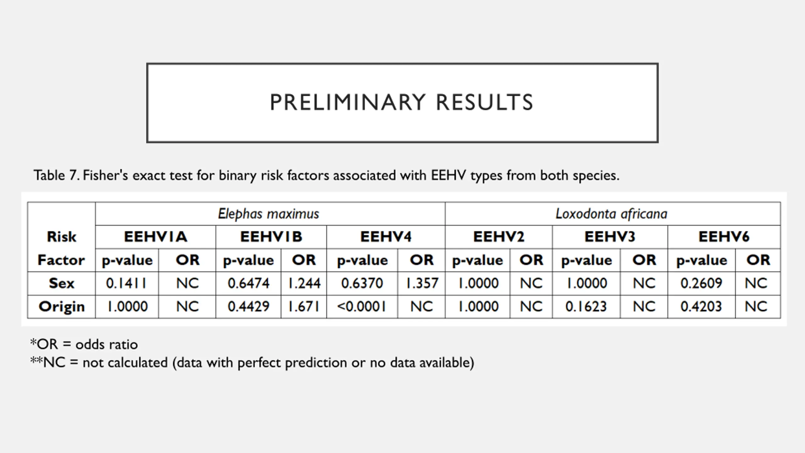 PRELIMINARY RESULTS Table 7. Fisher's exact test for binary risk factors associated with EEHV types from both species. *OR = odds ratio **NC = not calculated (data with perfect prediction or no data available)