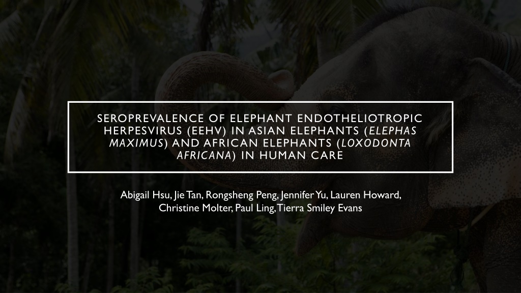 This study investigates the seroprevalence of Elephant Endotheliotropic Herpesvirus (EEHV) in Asian and African elephants in human care. It covers the background, epidemiology, types, and hemorrhagic disease associated with EEHV. The research sheds light on the impact of EEHV on elephants in captivity.