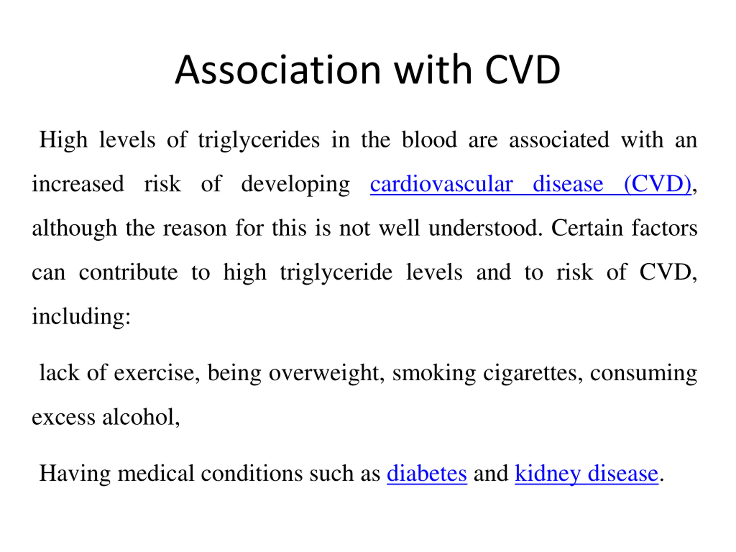 Association with CVD High levels of triglycerides in the blood are associated with an increased risk of developing cardiovascular disease (CVD), although the reason for this is not well understood. Certain factors can contribute to high triglyceride levels and to risk of CVD, including: lack of exercise, being overweight, smoking cigarettes, consuming excess alcohol, Having medical conditions such as diabetes and kidney disease.