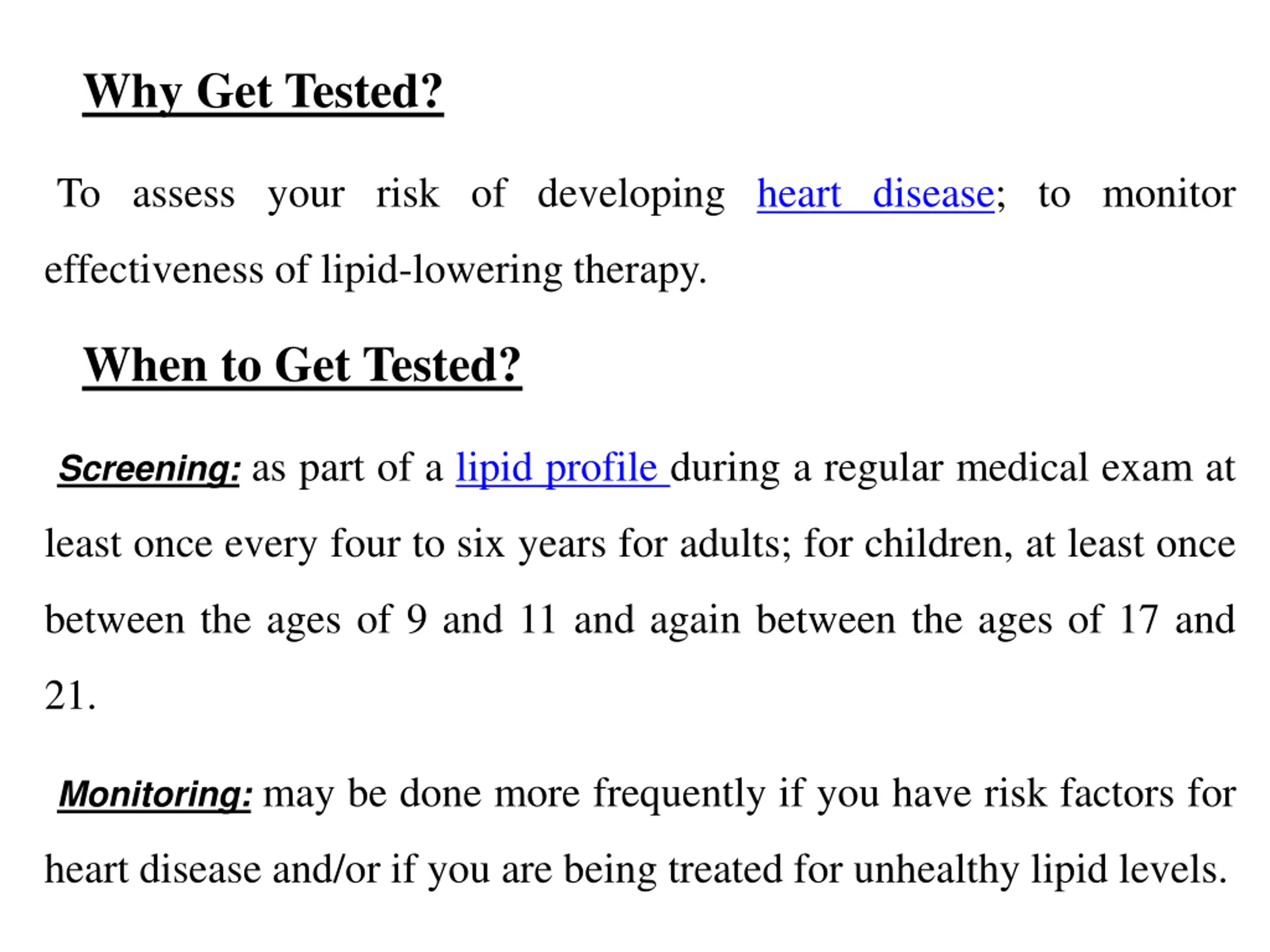 Why Get Tested? To assess your risk of developing heart disease; to monitor effectiveness of lipid-lowering therapy. When to Get Tested? Screening: as part of a lipid profile during a regular medical exam at least once every four to six years for adults; for children, at least once between the ages of 9 and 11 and again between the ages of 17 and 21. Monitoring: may be done more frequently if you have risk factors for heart disease and/or if you are being treated for unhealthy lipid levels.