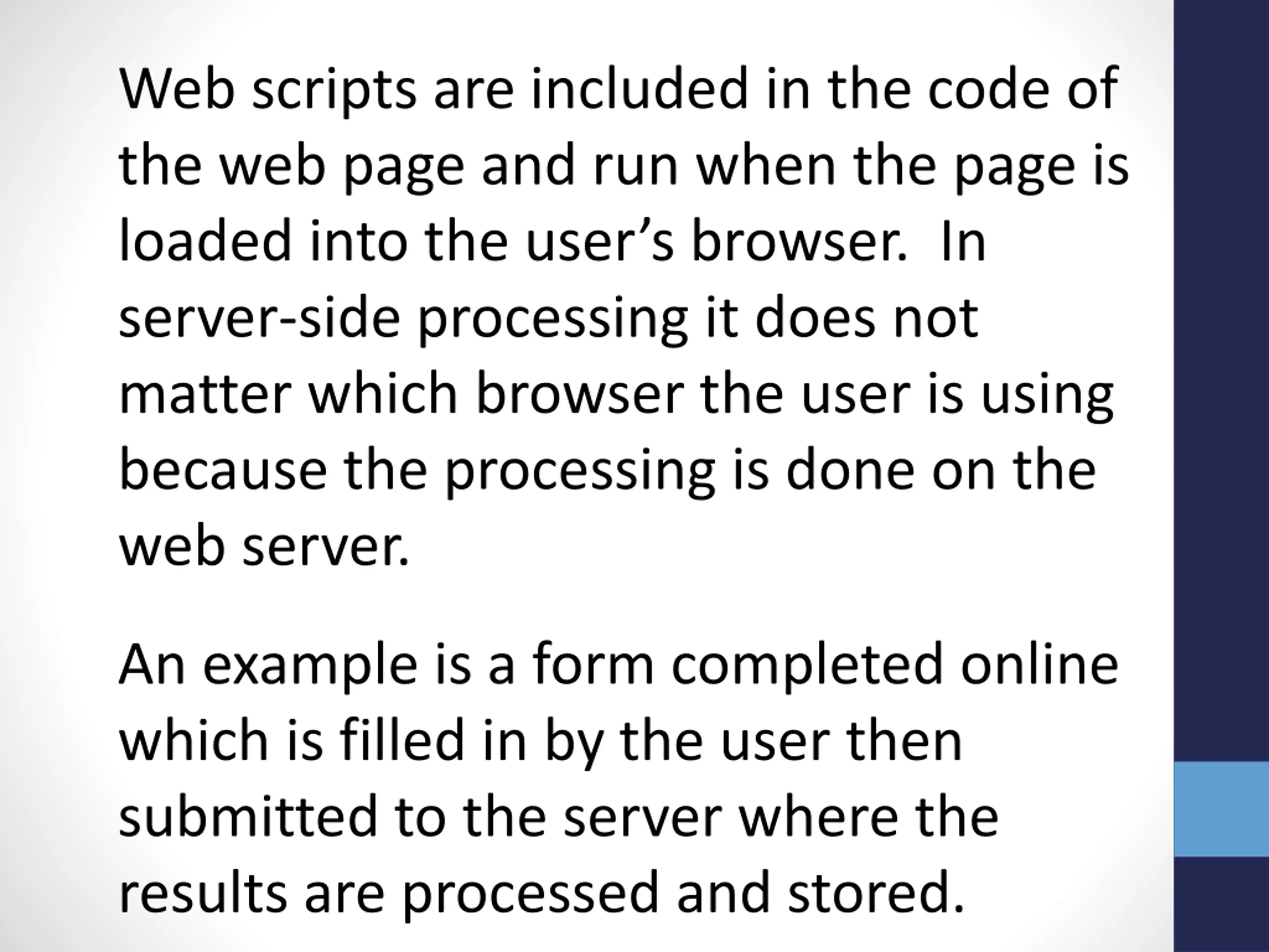 Web scripts are included in the code of the web page and run when the page is loaded into the user s browser. In server-side processing it does not matter which browser the user is using because the processing is done on the web server. An example is a form completed online which is filled in by the user then submitted to the server where the results are processed and stored.