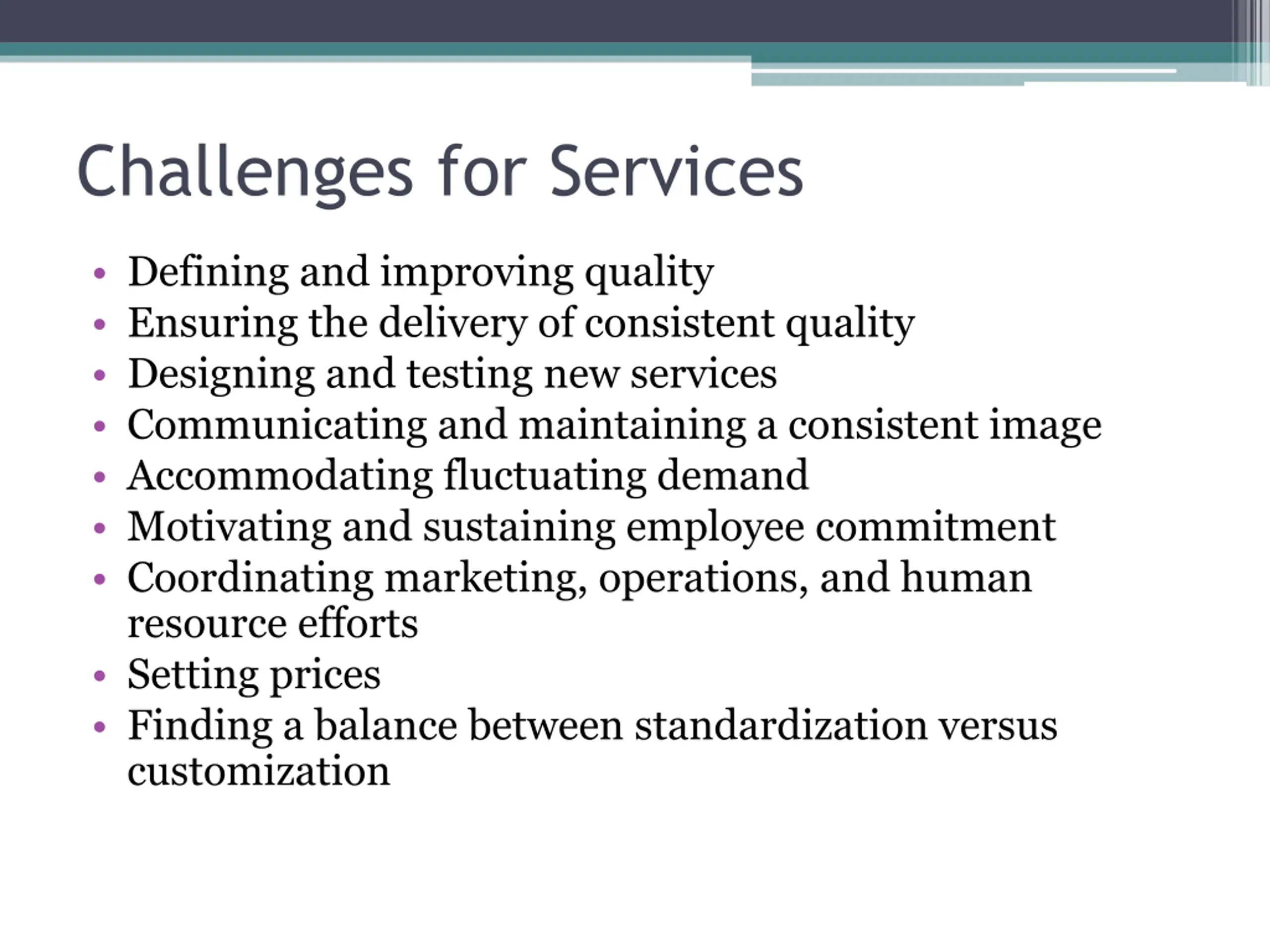 Challenges for Services Defining and improving quality Ensuring the delivery of consistent quality Designing and testing new services Communicating and maintaining a consistent image Accommodating fluctuating demand Motivating and sustaining employee commitment Coordinating marketing, operations, and human resource efforts Setting prices Finding a balance between standardization versus customization