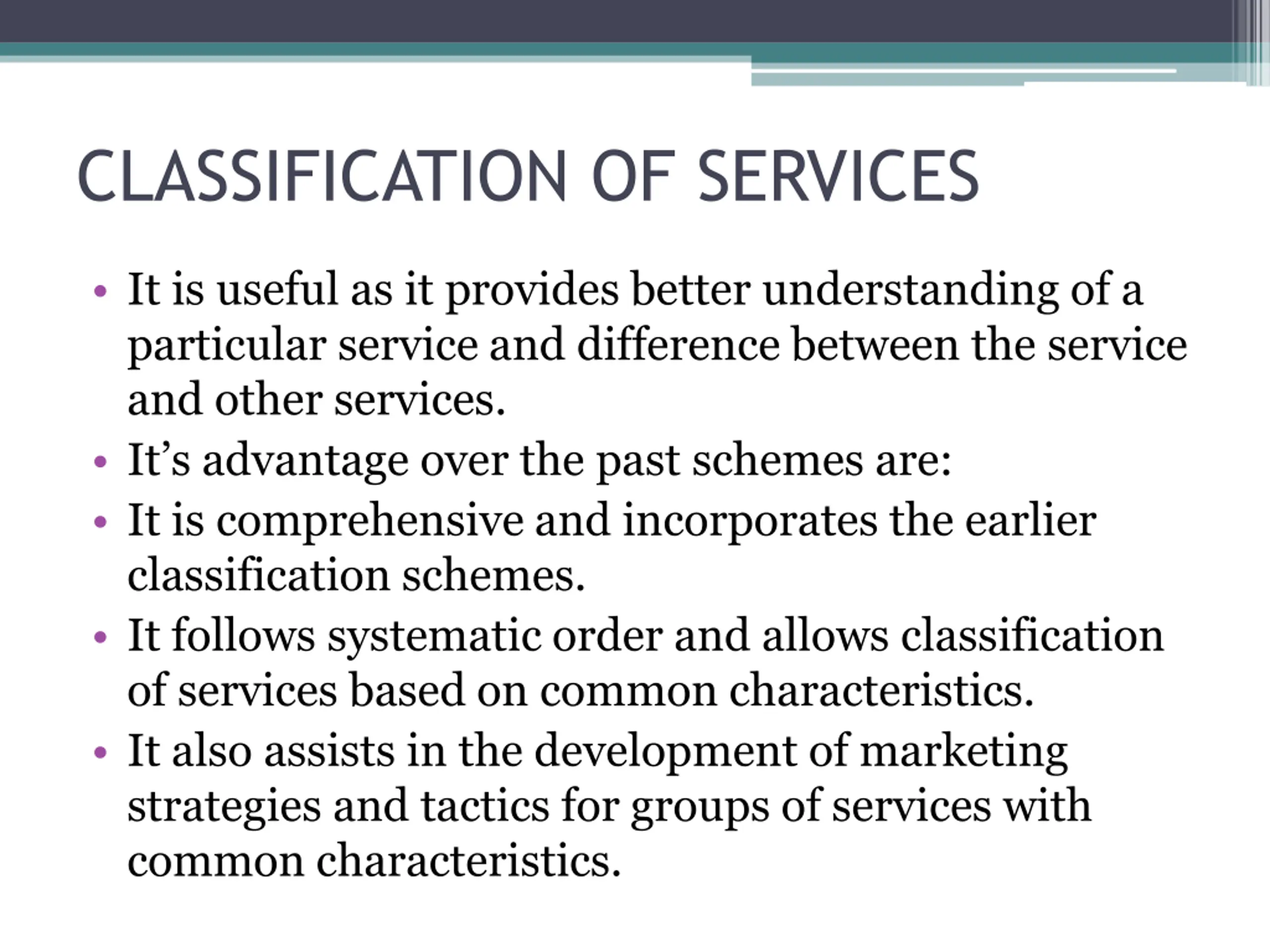 CLASSIFICATION OF SERVICES It is useful as it provides better understanding of a particular service and difference between the service and other services. It s advantage over the past schemes are: It is comprehensive and incorporates the earlier classification schemes. It follows systematic order and allows classification of services based on common characteristics. It also assists in the development of marketing strategies and tactics for groups of services with common characteristics.