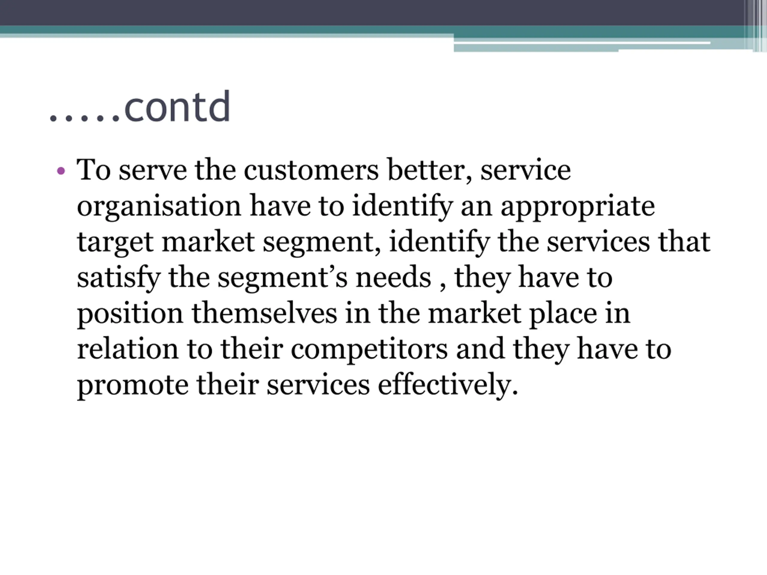 .....contd To serve the customers better, service organisation have to identify an appropriate target market segment, identify the services that satisfy the segment s needs , they have to position themselves in the market place in relation to their competitors and they have to promote their services effectively.