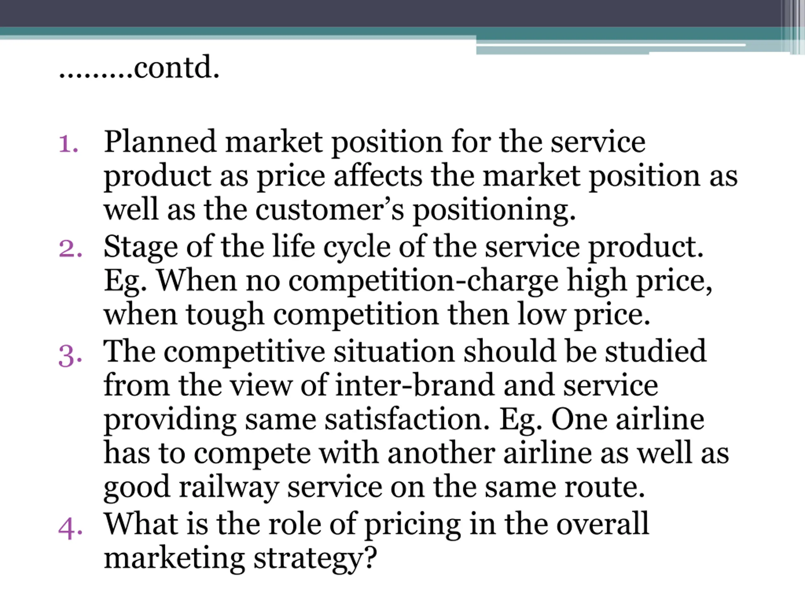 .........contd. 1. Planned market position for the service product as price affects the market position as well as the customer s positioning. 2. Stage of the life cycle of the service product. Eg. When no competition-charge high price, when tough competition then low price. 3. The competitive situation should be studied from the view of inter-brand and service providing same satisfaction. Eg. One airline has to compete with another airline as well as good railway service on the same route. 4. What is the role of pricing in the overall marketing strategy?