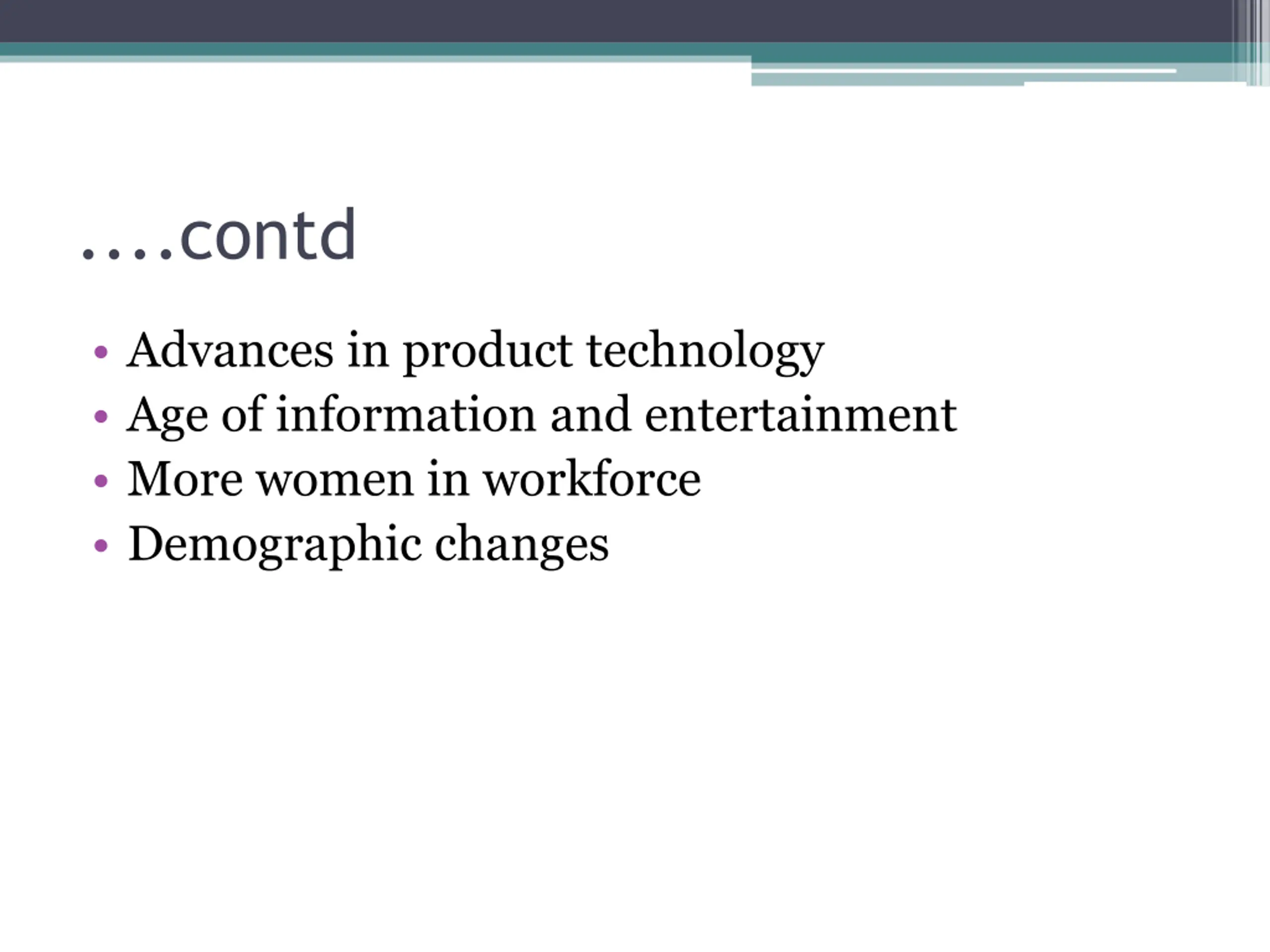 ....contd Advances in product technology Age of information and entertainment More women in workforce Demographic changes