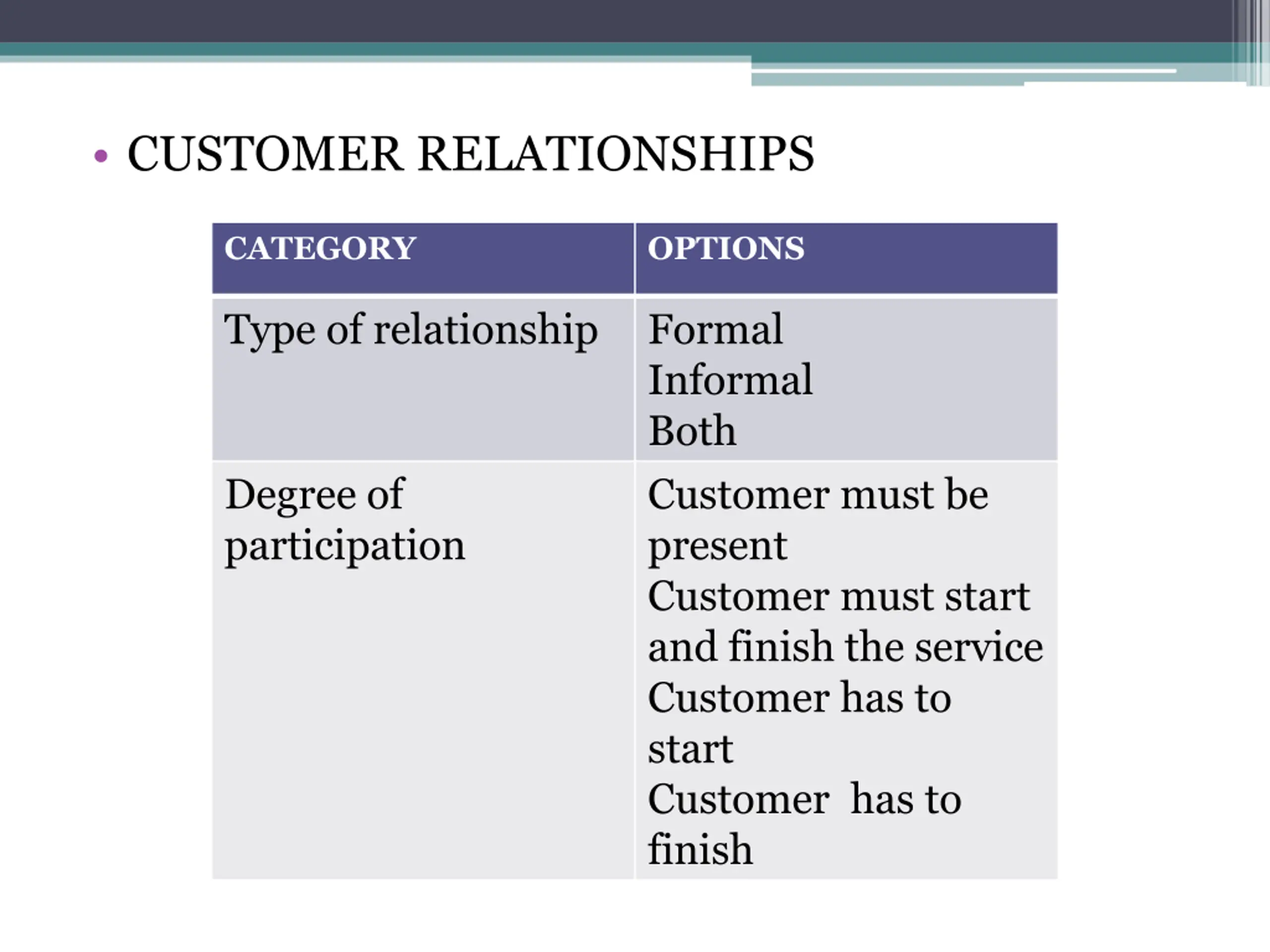 CUSTOMER RELATIONSHIPS CATEGORY OPTIONS Type of relationship Formal Informal Both Customer must be present Customer must start and finish the service Customer has to start Customer has to finish Degree of participation
