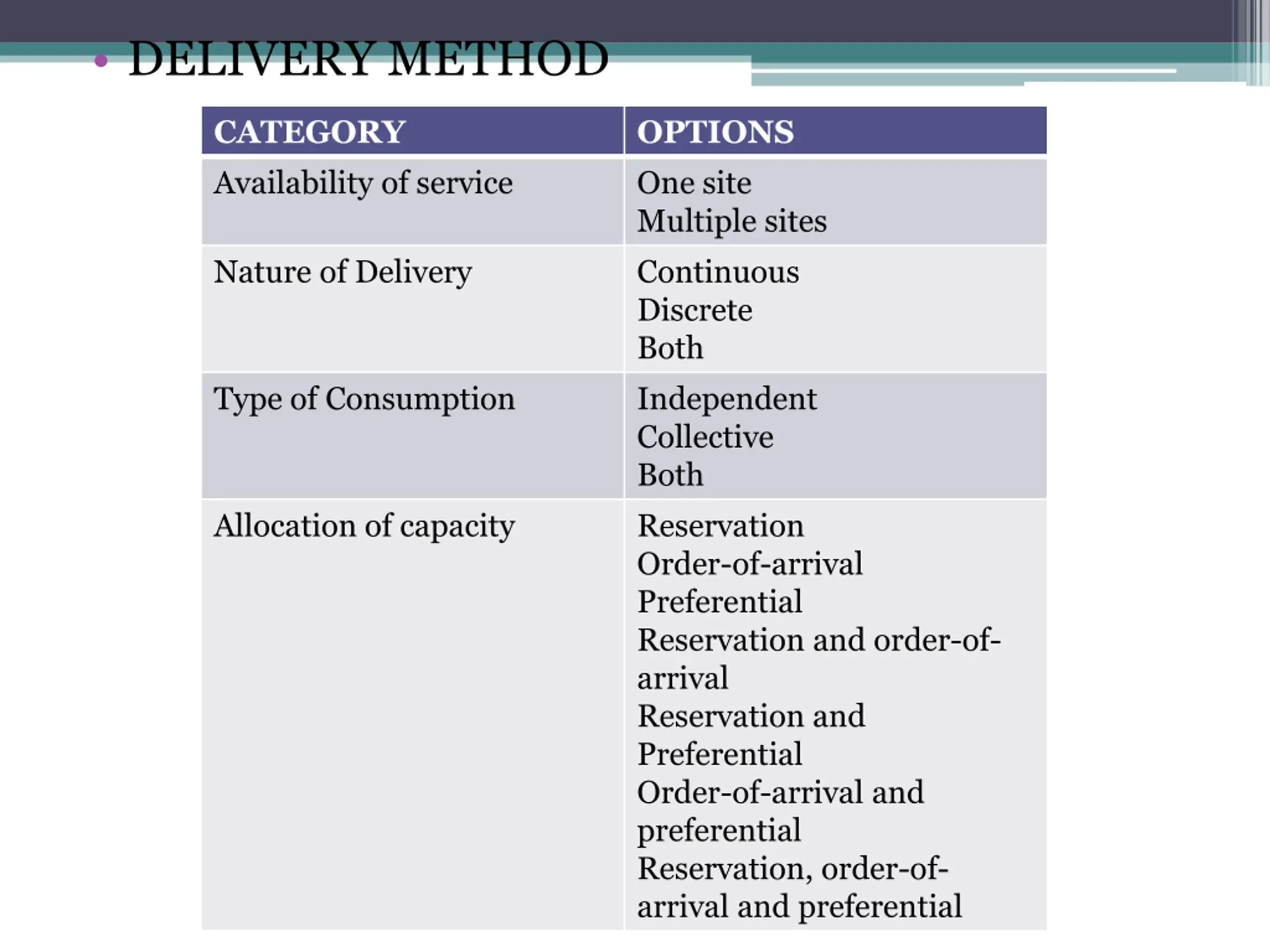DELIVERY METHOD CATEGORY Availability of service OPTIONS One site Multiple sites Continuous Discrete Both Independent Collective Both Reservation Order-of-arrival Preferential Reservation and order-of- arrival Reservation and Preferential Order-of-arrival and preferential Reservation, order-of- arrival and preferential Nature of Delivery Type of Consumption Allocation of capacity