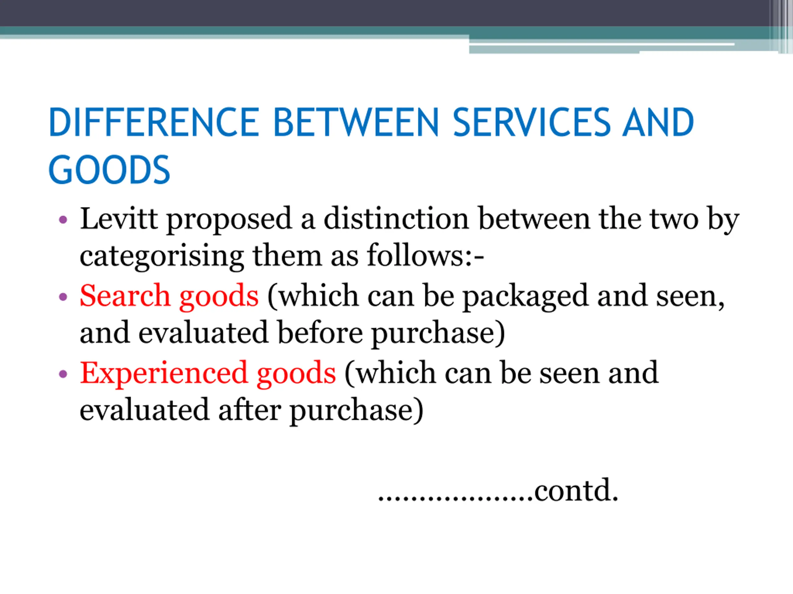 DIFFERENCE BETWEEN SERVICES AND GOODS Levitt proposed a distinction between the two by categorising them as follows:- Search goods (which can be packaged and seen, and evaluated before purchase) Experienced goods (which can be seen and evaluated after purchase) ...................contd.