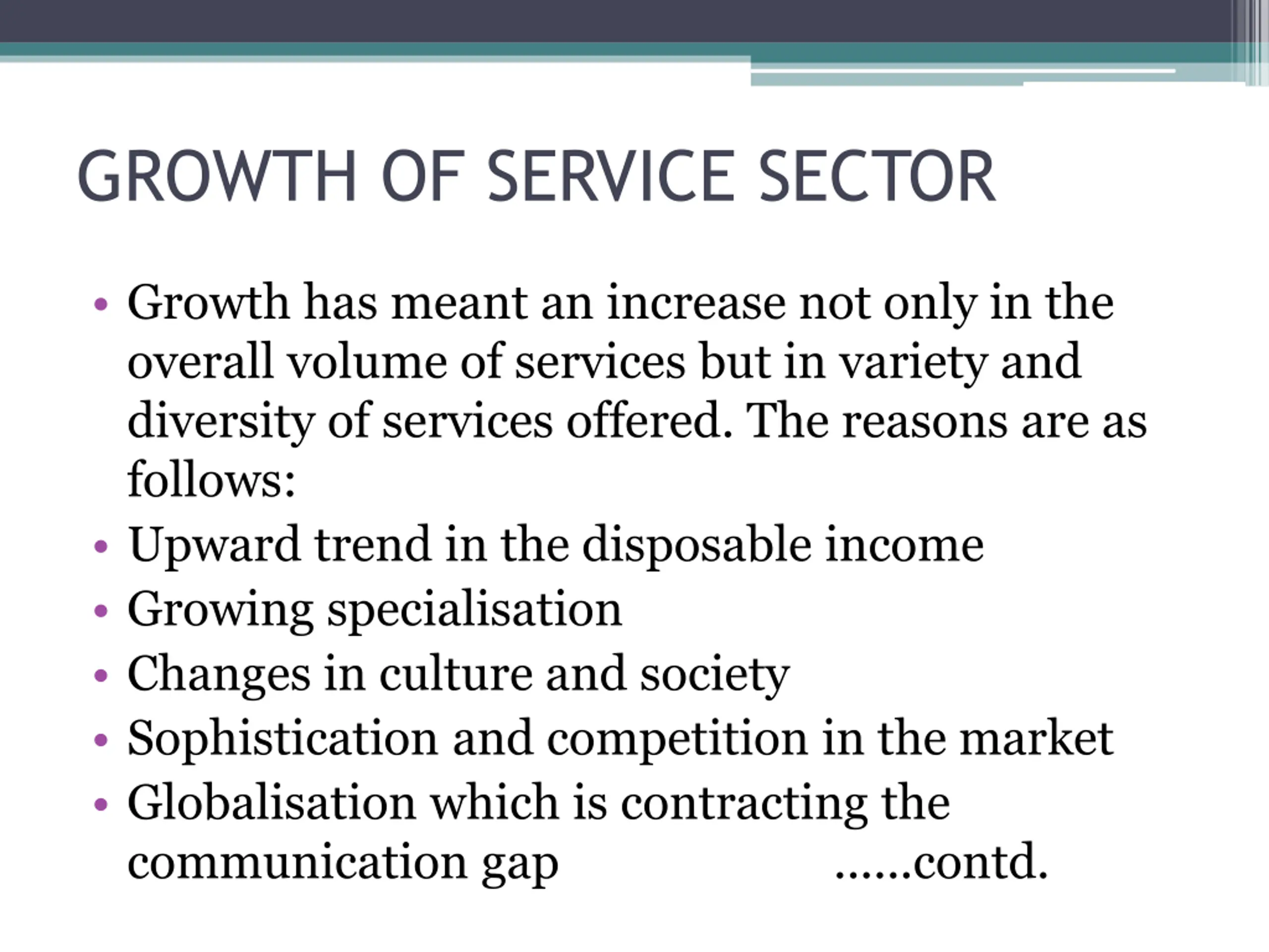 GROWTH OF SERVICE SECTOR Growth has meant an increase not only in the overall volume of services but in variety and diversity of services offered. The reasons are as follows: Upward trend in the disposable income Growing specialisation Changes in culture and society Sophistication and competition in the market Globalisation which is contracting the communication gap ......contd.