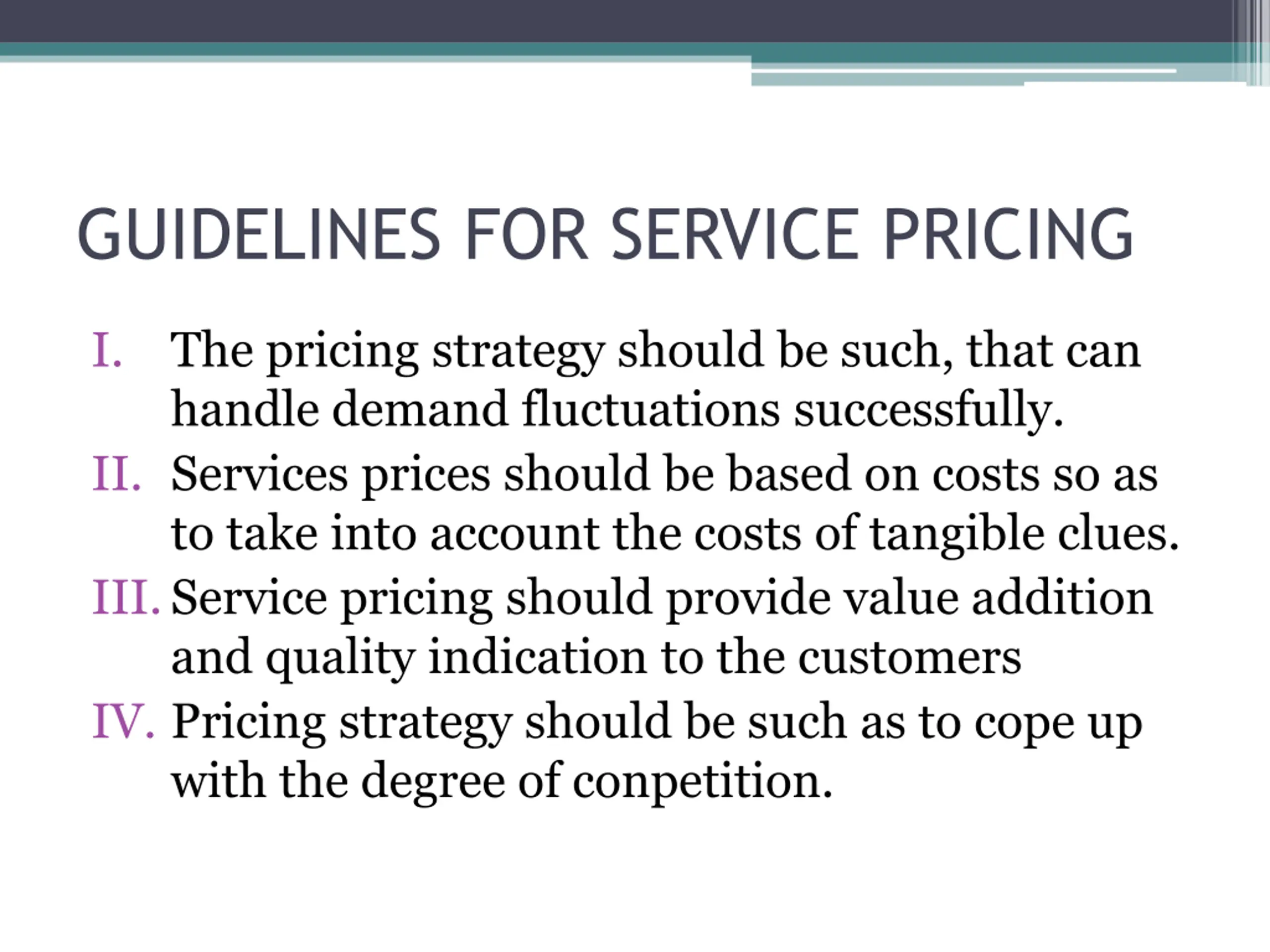 GUIDELINES FOR SERVICE PRICING I. The pricing strategy should be such, that can handle demand fluctuations successfully. II. Services prices should be based on costs so as to take into account the costs of tangible clues. III.Service pricing should provide value addition and quality indication to the customers IV. Pricing strategy should be such as to cope up with the degree of conpetition.