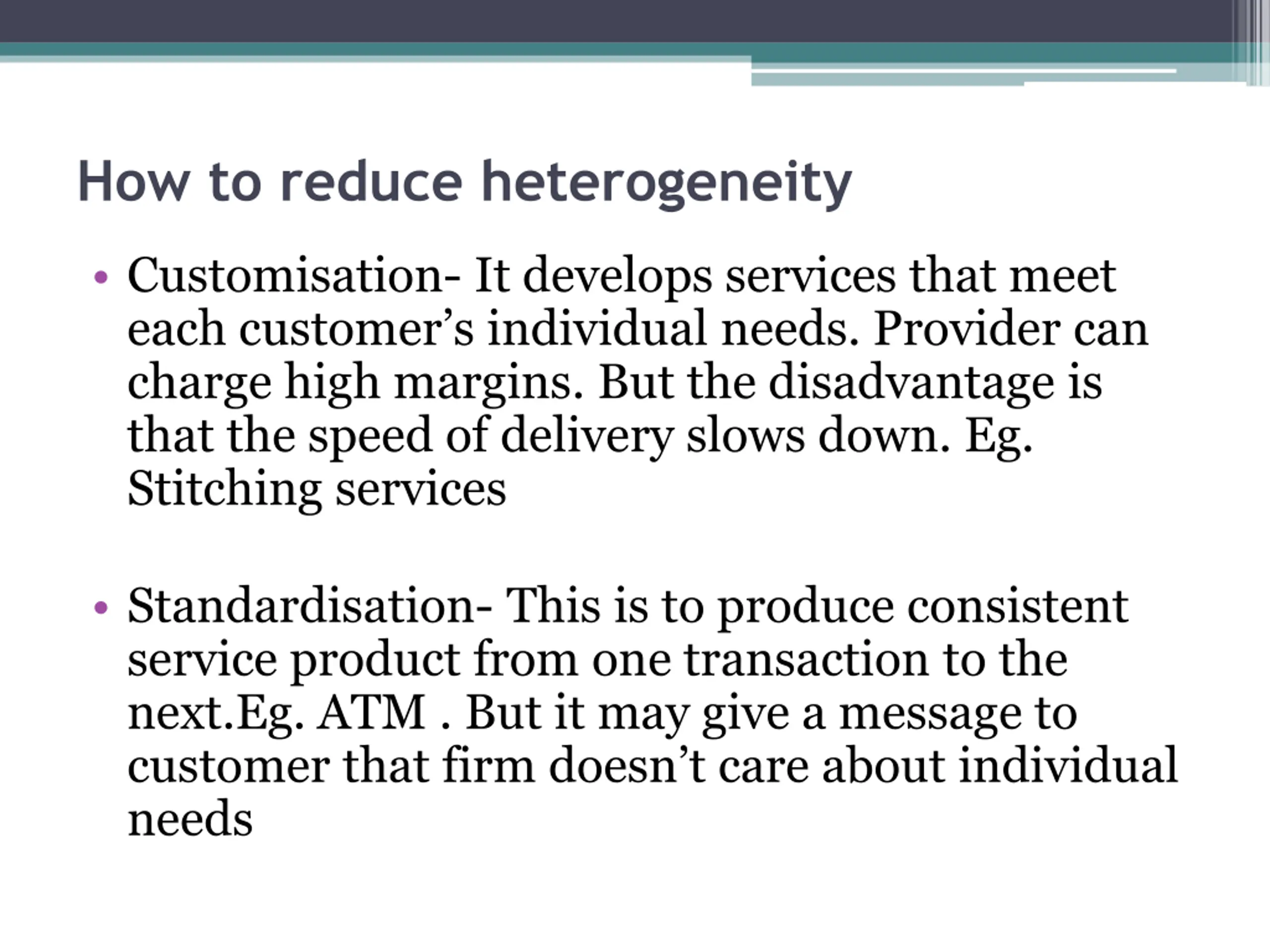 How to reduce heterogeneity Customisation- It develops services that meet each customer s individual needs. Provider can charge high margins. But the disadvantage is that the speed of delivery slows down. Eg. Stitching services Standardisation- This is to produce consistent service product from one transaction to the next.Eg. ATM . But it may give a message to customer that firm doesn t care about individual needs