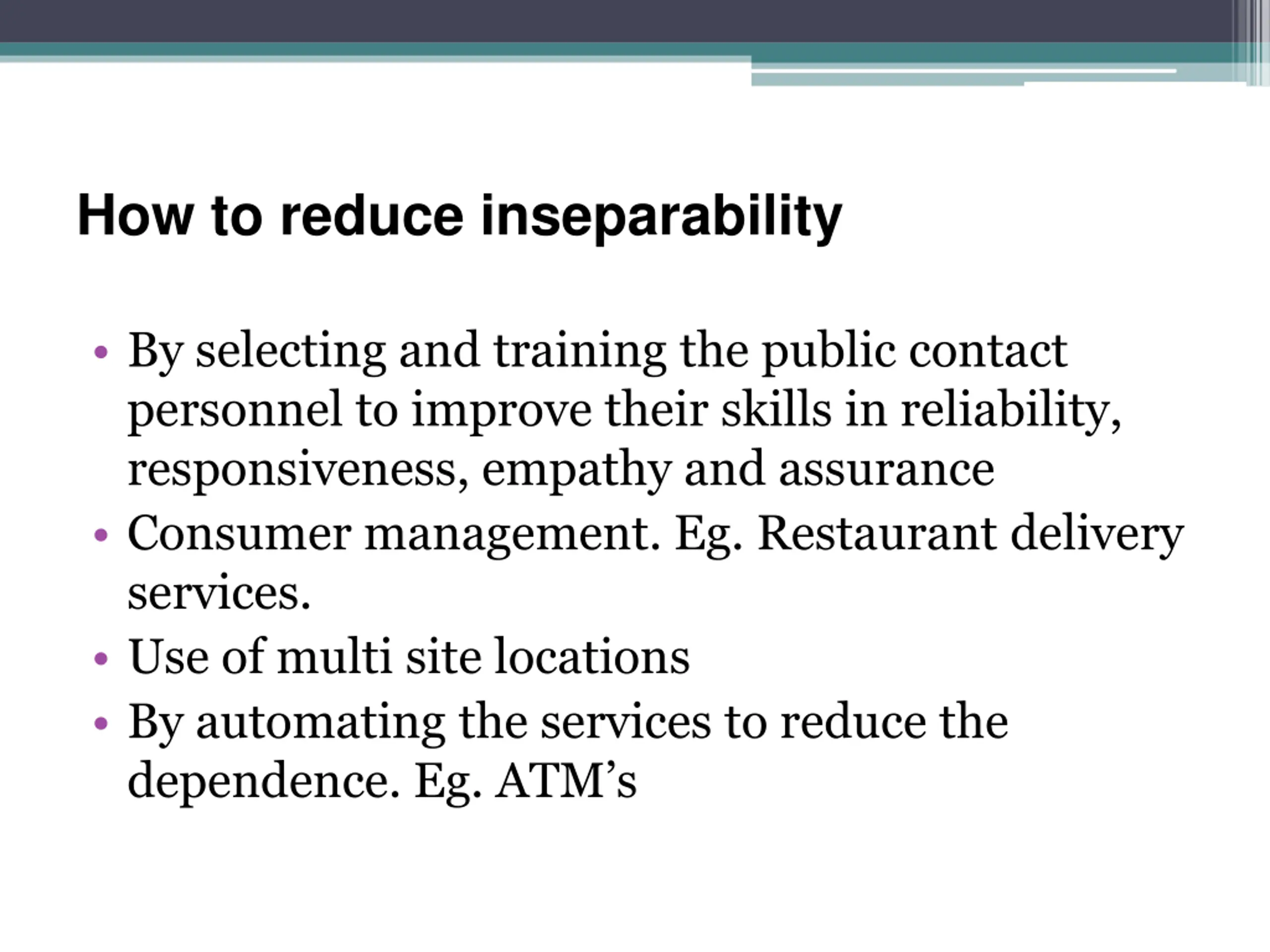 How to reduce inseparability By selecting and training the public contact personnel to improve their skills in reliability, responsiveness, empathy and assurance Consumer management. Eg. Restaurant delivery services. Use of multi site locations By automating the services to reduce the dependence. Eg. ATM s