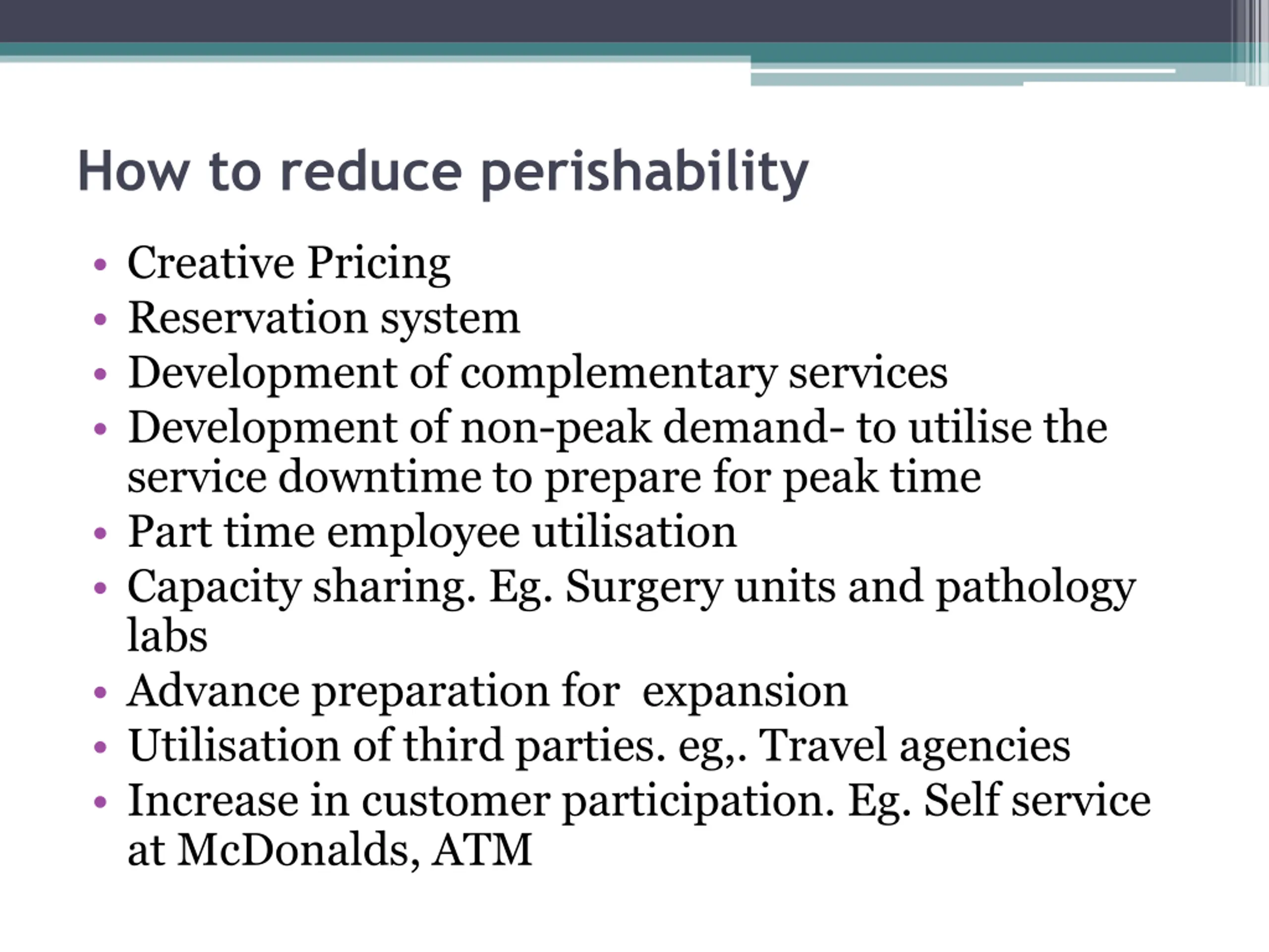 How to reduce perishability Creative Pricing Reservation system Development of complementary services Development of non-peak demand- to utilise the service downtime to prepare for peak time Part time employee utilisation Capacity sharing. Eg. Surgery units and pathology labs Advance preparation for expansion Utilisation of third parties. eg,. Travel agencies Increase in customer participation. Eg. Self service at McDonalds, ATM