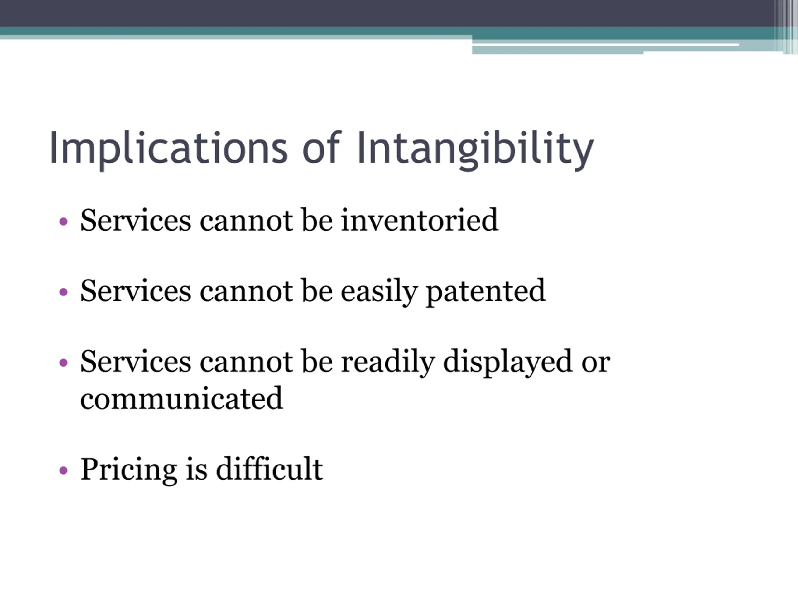 Implications of Intangibility Services cannot be inventoried Services cannot be easily patented Services cannot be readily displayed or communicated Pricing is difficult