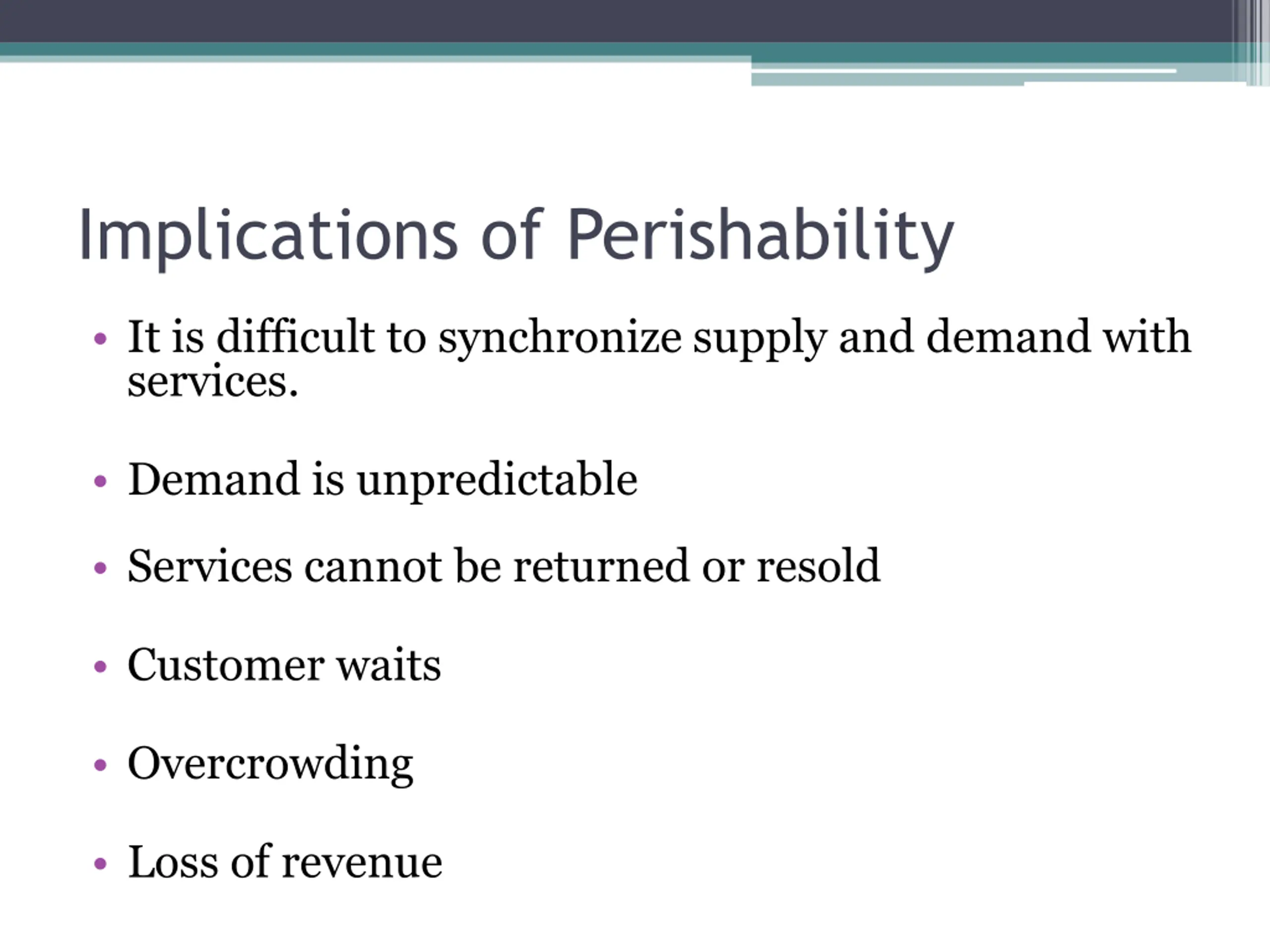 Implications of Perishability It is difficult to synchronize supply and demand with services. Demand is unpredictable Services cannot be returned or resold Customer waits Overcrowding Loss of revenue