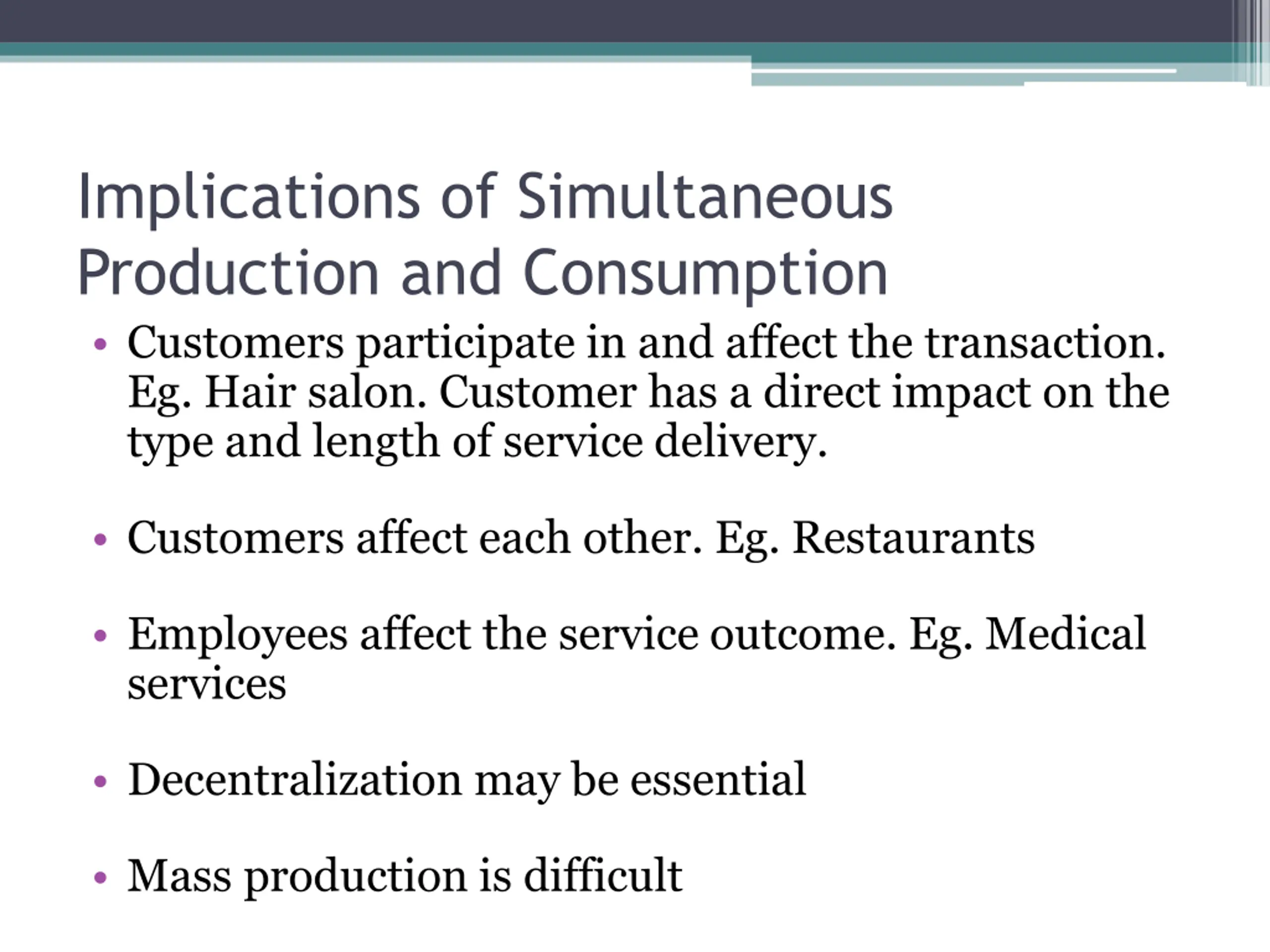 Implications of Simultaneous Production and Consumption Customers participate in and affect the transaction. Eg. Hair salon. Customer has a direct impact on the type and length of service delivery. Customers affect each other. Eg. Restaurants Employees affect the service outcome. Eg. Medical services Decentralization may be essential Mass production is difficult