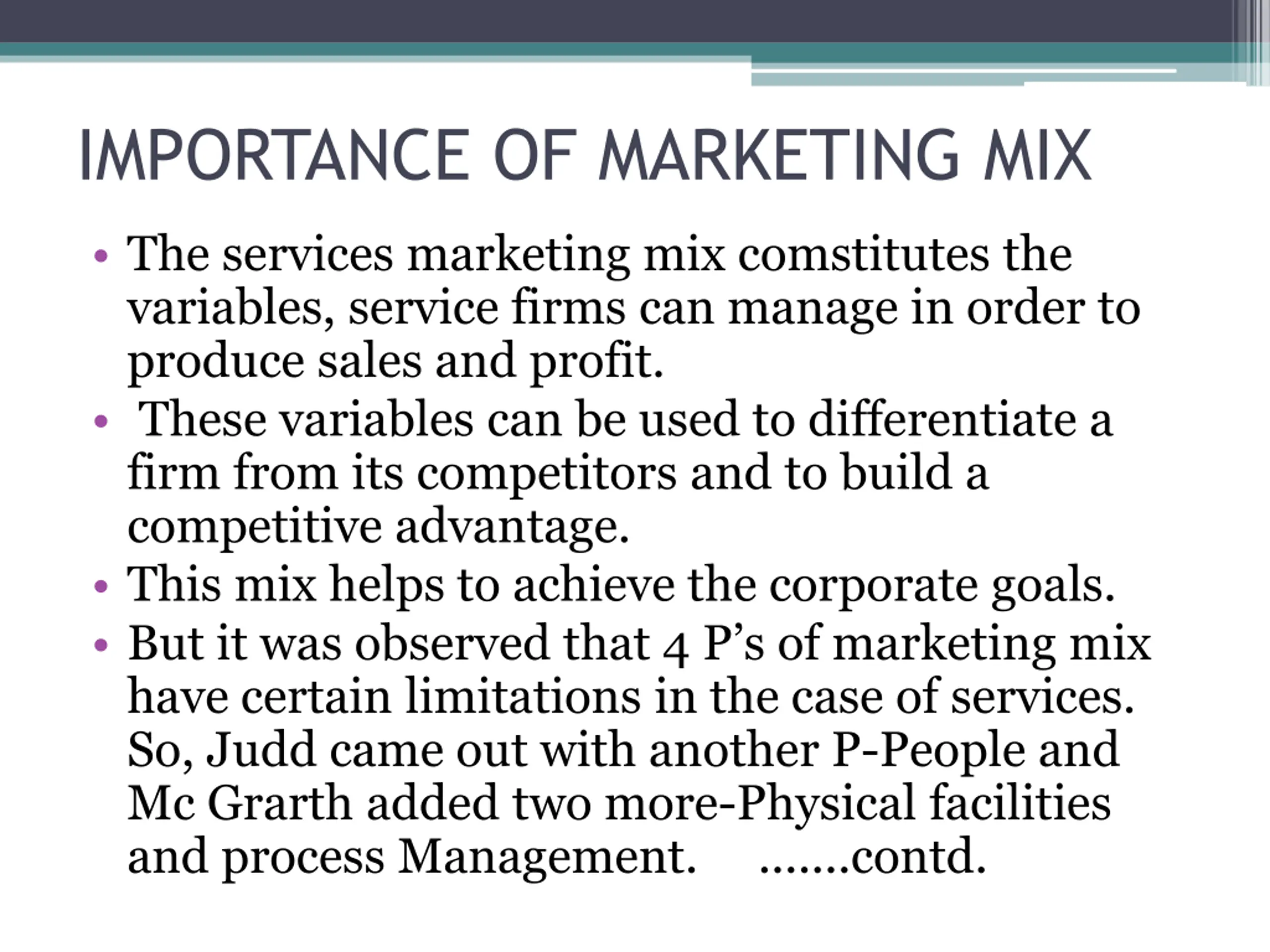 IMPORTANCE OF MARKETING MIX The services marketing mix comstitutes the variables, service firms can manage in order to produce sales and profit. These variables can be used to differentiate a firm from its competitors and to build a competitive advantage. This mix helps to achieve the corporate goals. But it was observed that 4 P s of marketing mix have certain limitations in the case of services. So, Judd came out with another P-People and Mc Grarth added two more-Physical facilities and process Management. .......contd.