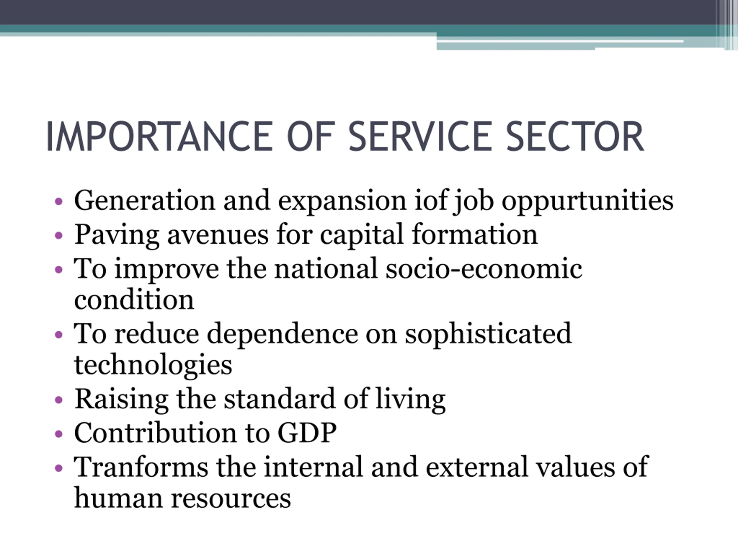 IMPORTANCE OF SERVICE SECTOR Generation and expansion iof job oppurtunities Paving avenues for capital formation To improve the national socio-economic condition To reduce dependence on sophisticated technologies Raising the standard of living Contribution to GDP Tranforms the internal and external values of human resources