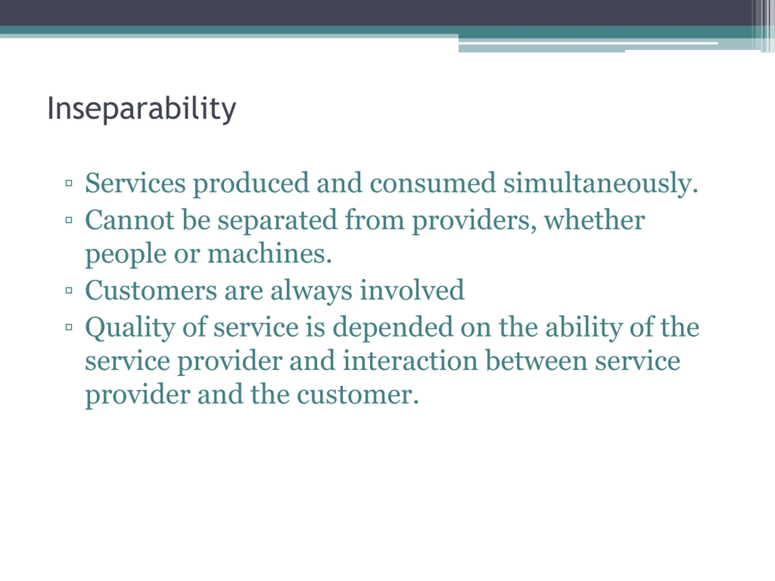 Inseparability Services produced and consumed simultaneously. Cannot be separated from providers, whether people or machines. Customers are always involved Quality of service is depended on the ability of the service provider and interaction between service provider and the customer.