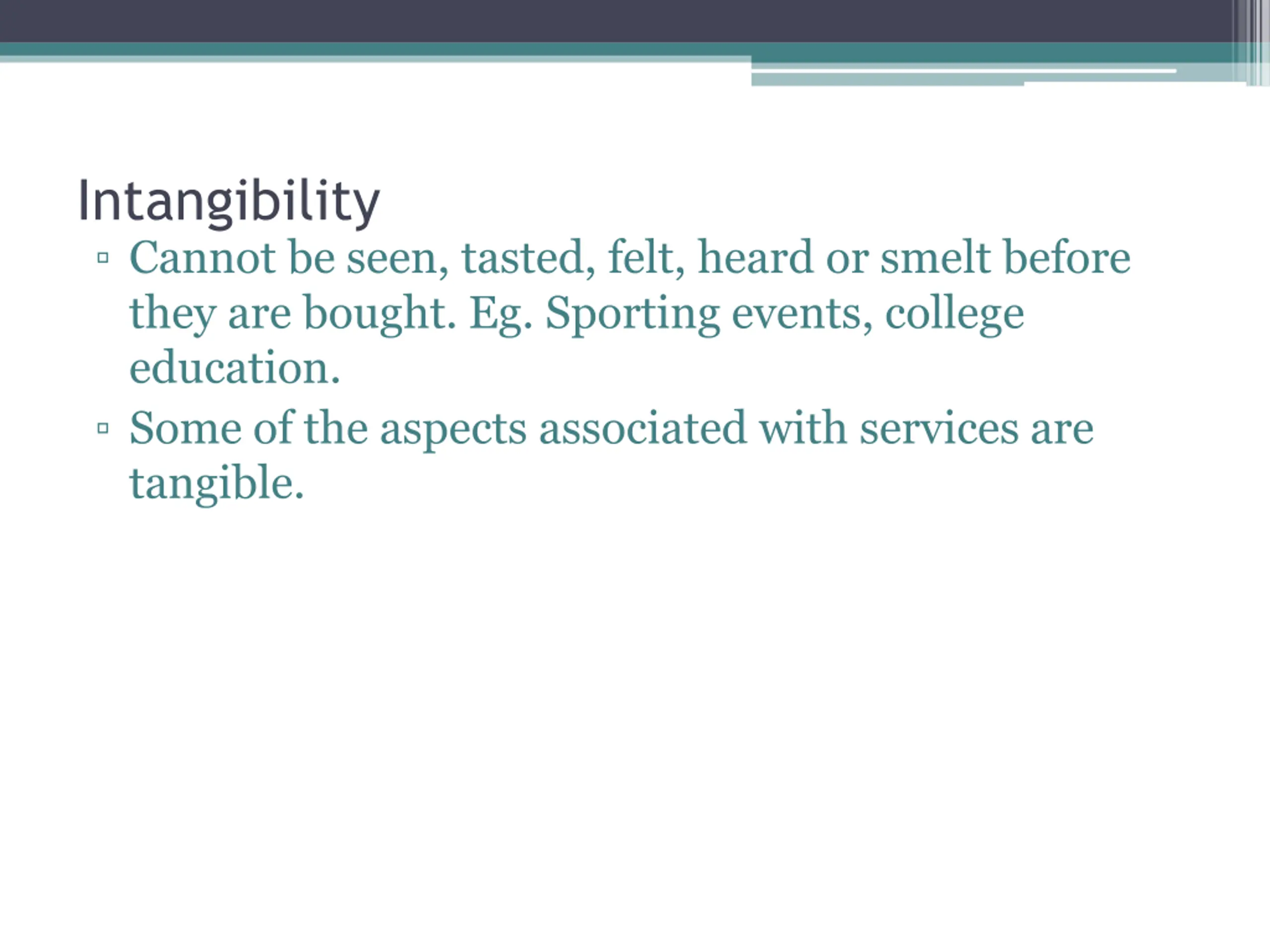 Intangibility Cannot be seen, tasted, felt, heard or smelt before they are bought. Eg. Sporting events, college education. Some of the aspects associated with services are tangible.