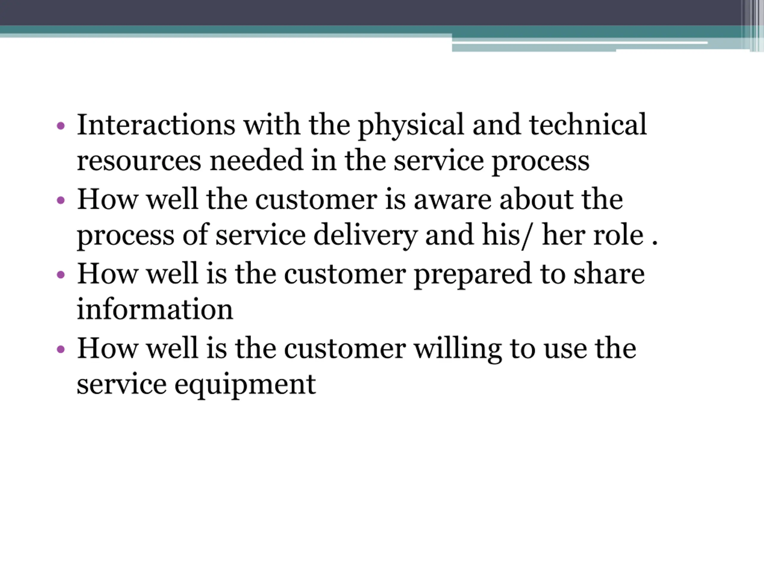 Interactions with the physical and technical resources needed in the service process How well the customer is aware about the process of service delivery and his/ her role . How well is the customer prepared to share information How well is the customer willing to use the service equipment