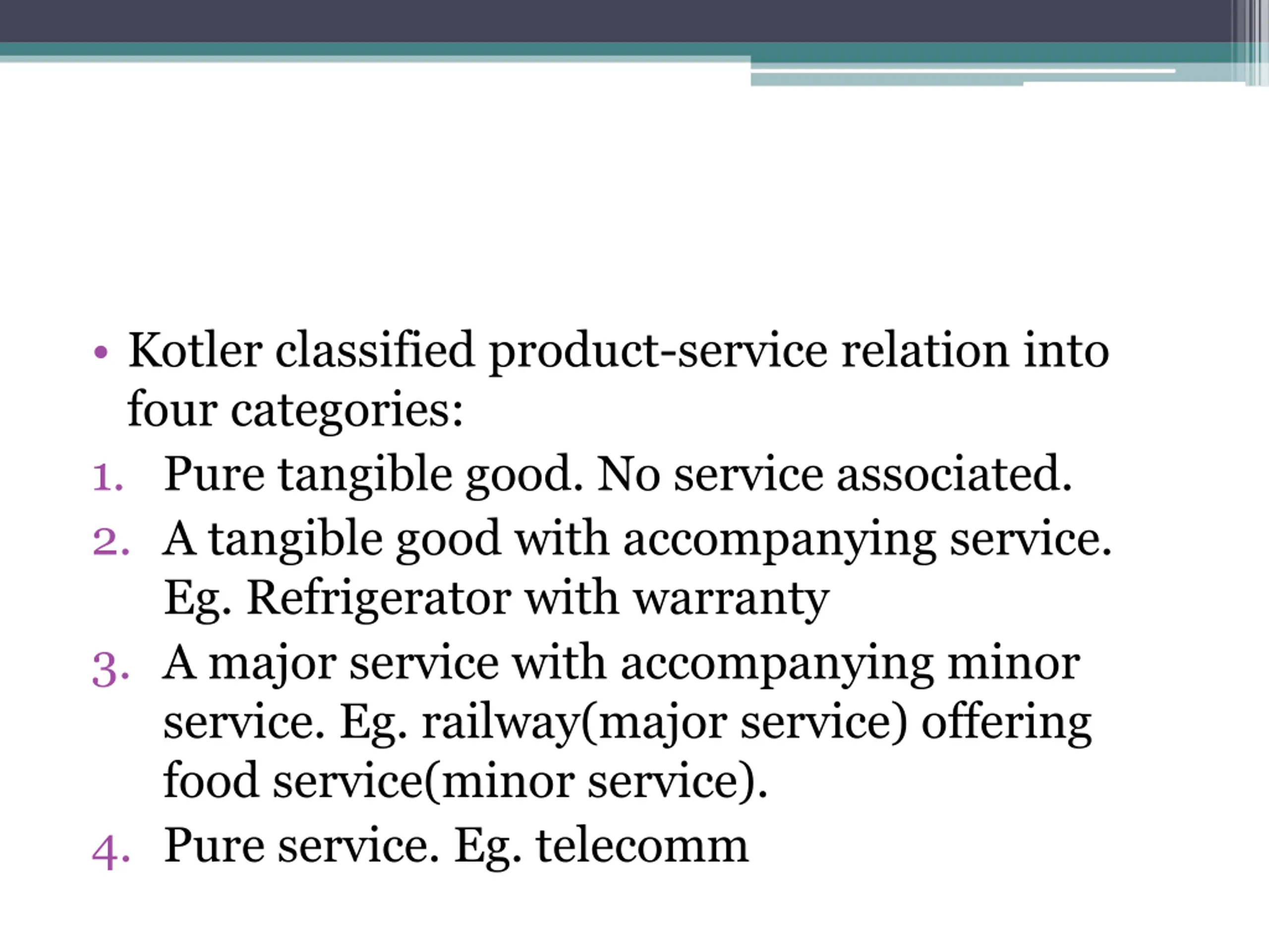 Kotler classified product-service relation into four categories: 1. Pure tangible good. No service associated. 2. A tangible good with accompanying service. Eg. Refrigerator with warranty 3. A major service with accompanying minor service. Eg. railway(major service) offering food service(minor service). 4. Pure service. Eg. telecomm