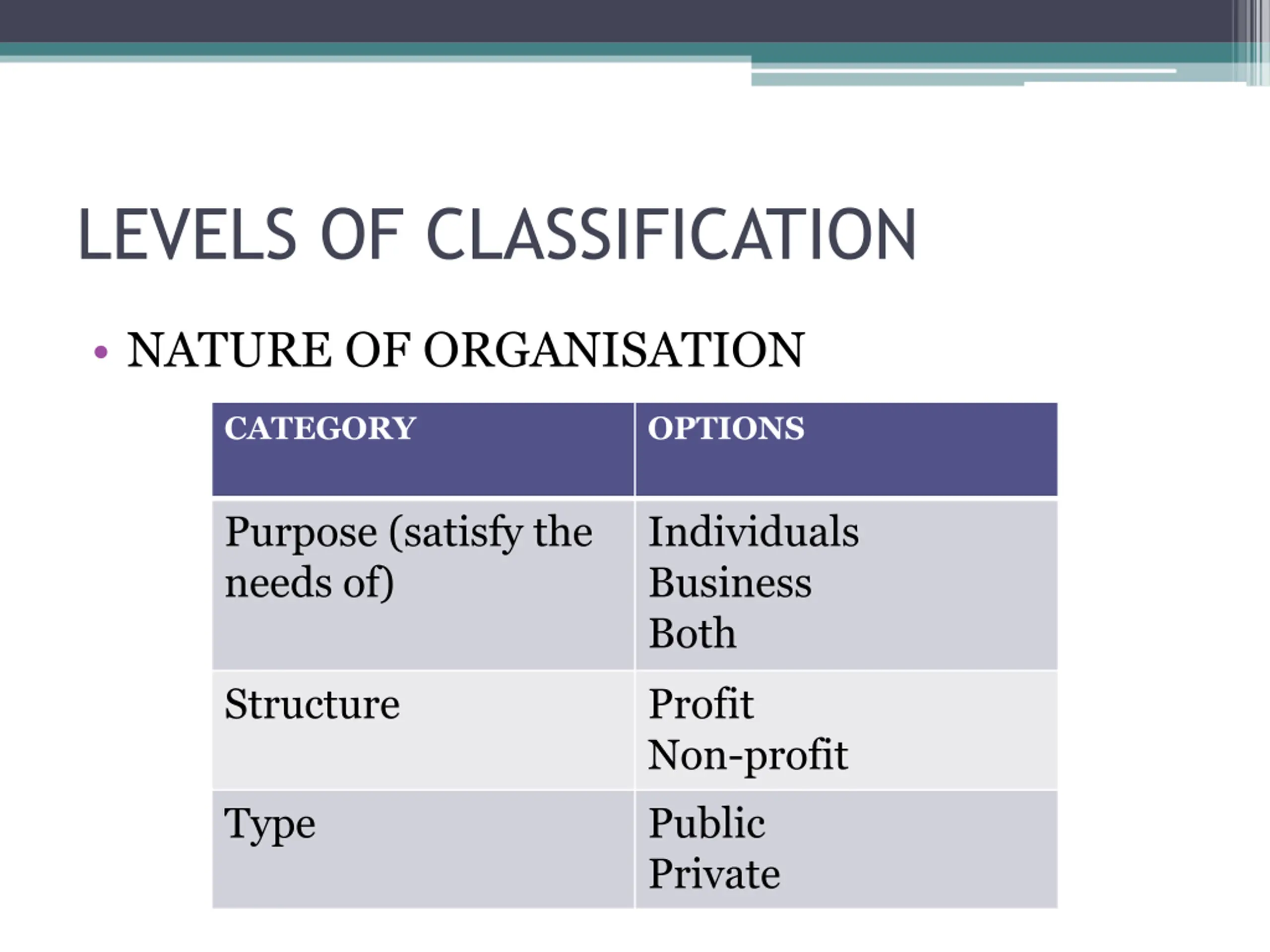 LEVELS OF CLASSIFICATION NATURE OF ORGANISATION CATEGORY OPTIONS Purpose (satisfy the needs of) Individuals Business Both Structure Profit Non-profit Public Private Type